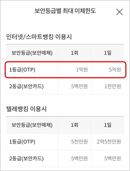 현재 사용하고 있는 보안매체에 따라 이체한도를 확인할 수 있습니다. 큰 금액을 이체해야 할 경우엔 디지털 OTP를 발급받아 사용하시는 것을 추천드립니다.