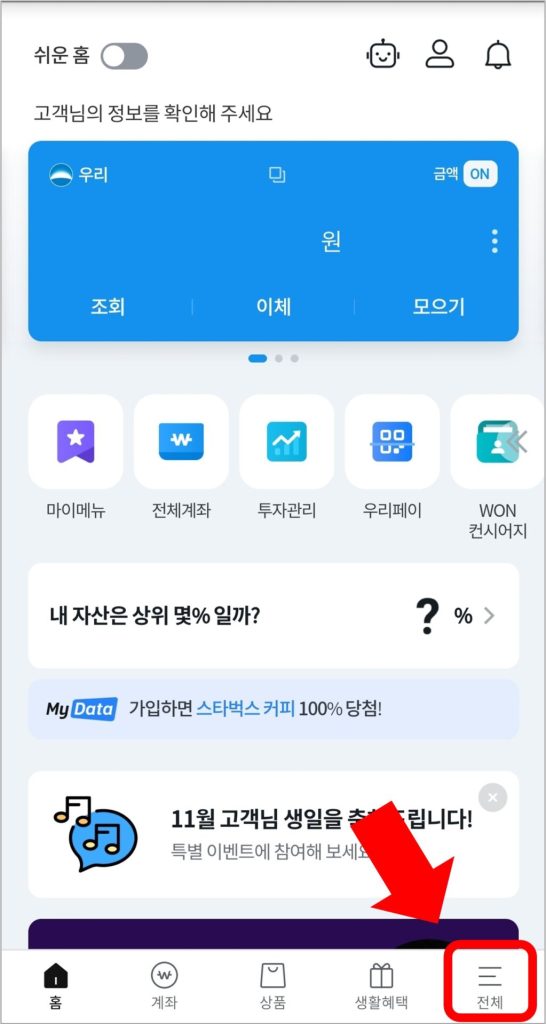 먼저, 우리은행 앱을 실행해서 로그인 한 뒤,