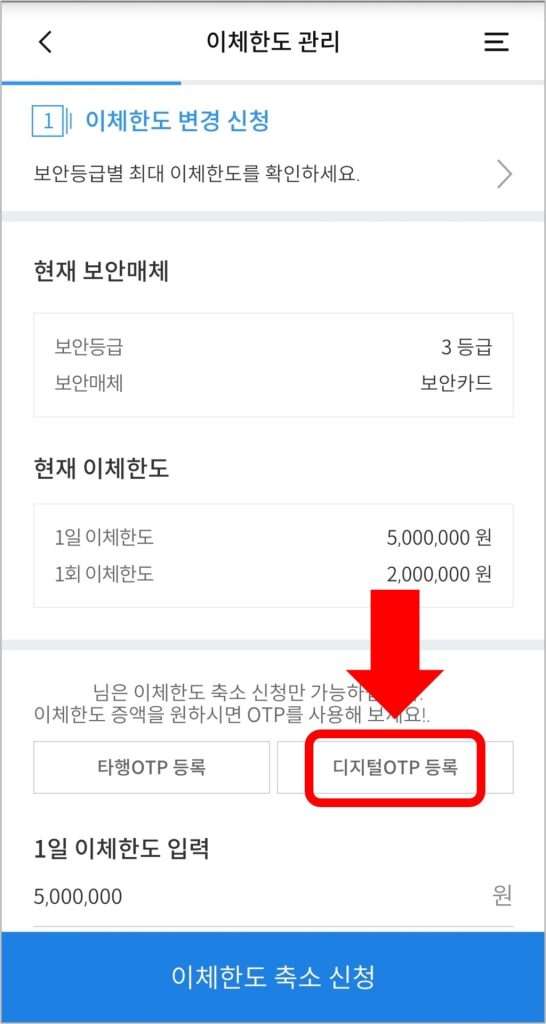 이체한도 변경 신청 화면에서 [디지털 OTP 등록]을 선택합니다.