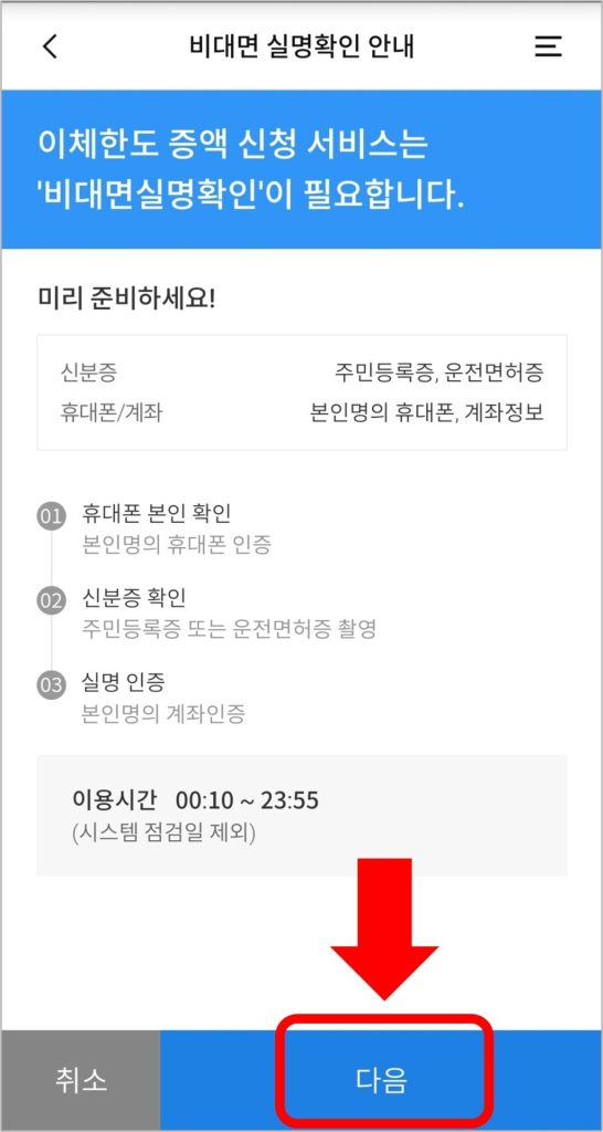 - 이체한도 증액 : 이체한도 증액 신청을 위해서는 실명확인이 필요합니다. 주민등록증이나 운전면허증을 준비하시기 바랍니다.