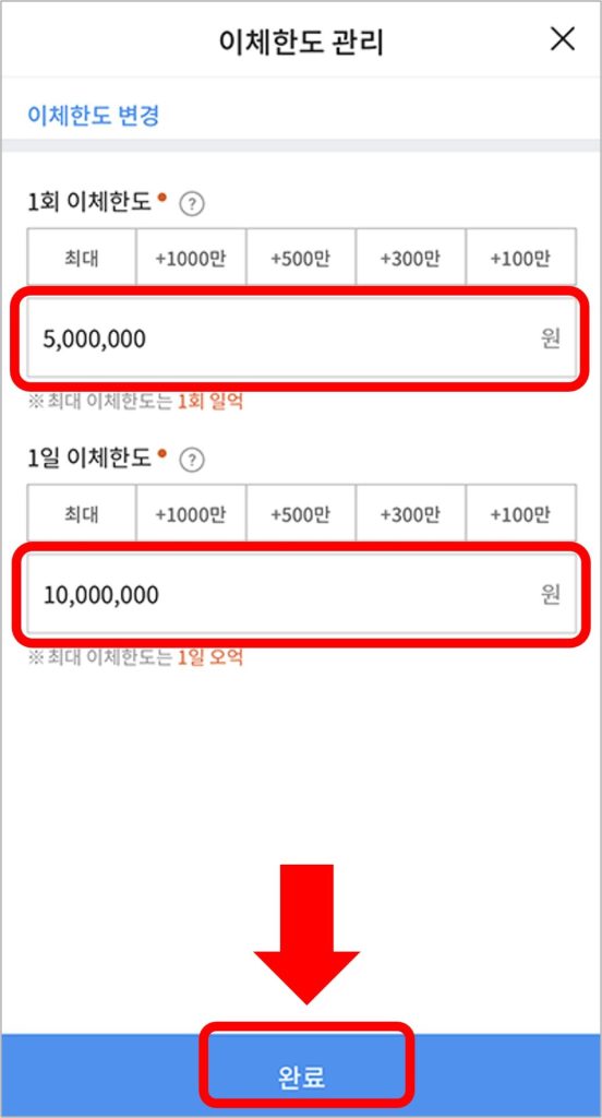 실명인증 후 원하는 이체한도액을 기입하면 증액이 완료됩니다.