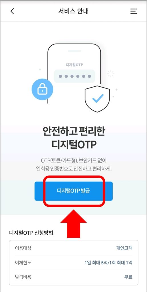 → [비밀번호 입력] 순으로 진행하면 디지털 OTP 발급이 완료됩니다.