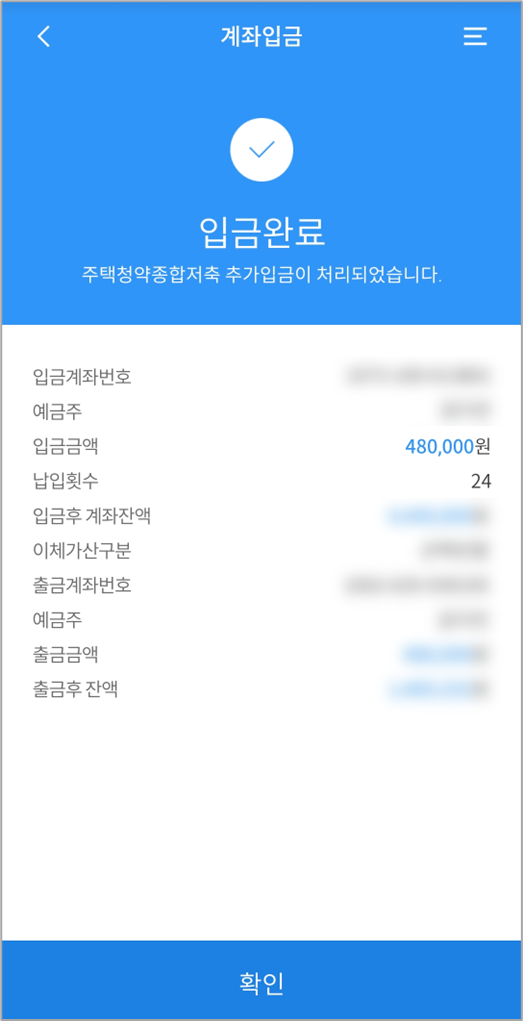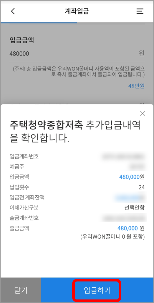 입금 전에 입금금액과 납입횟수를 다시 한번 확인할 수 있습니다.