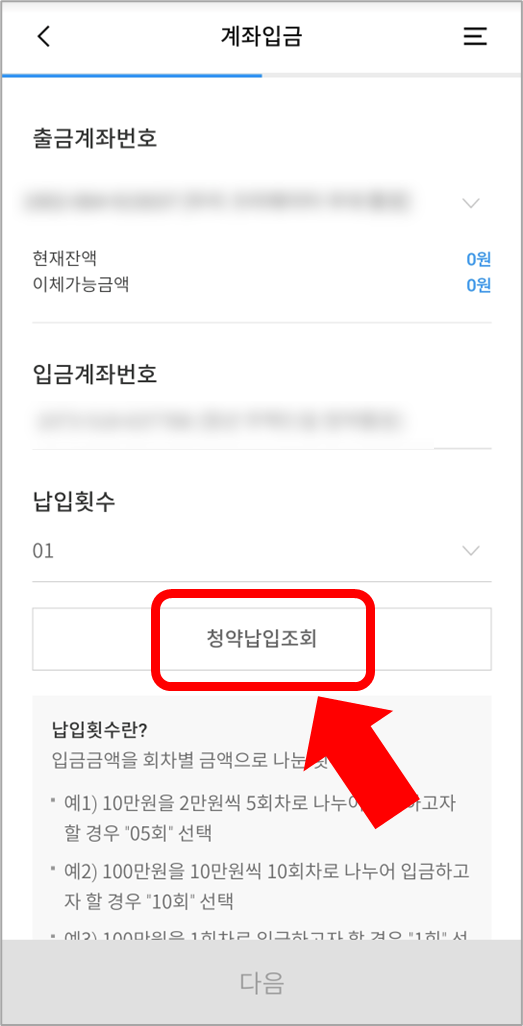 미납금은 아까 들어갔던 청약통장 입금 페이지에서 입금합니다.