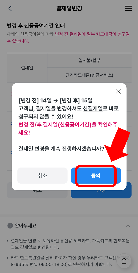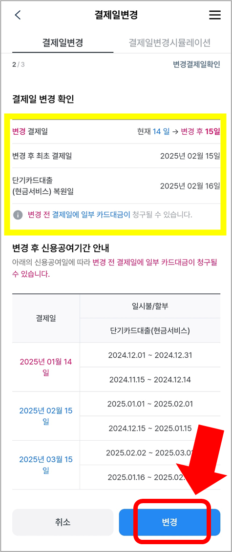 변경되는 결제일에 따은 카드 이용기간 등을 확인하고 [변경] → [동의]하면 변경이 완료됩니다.