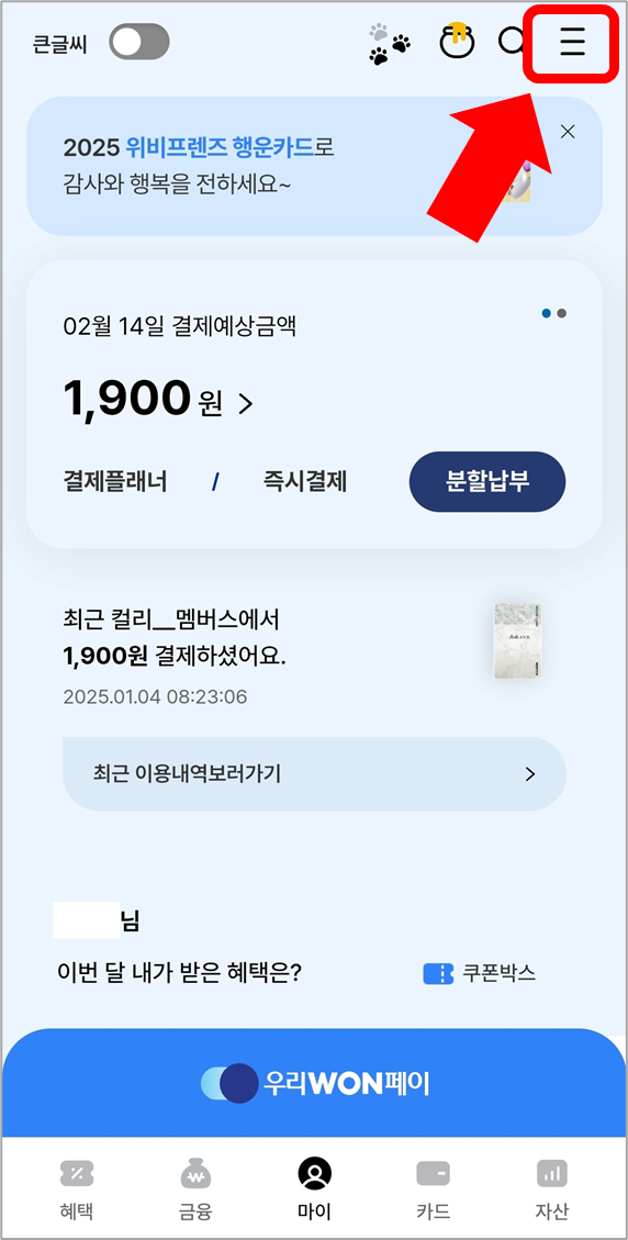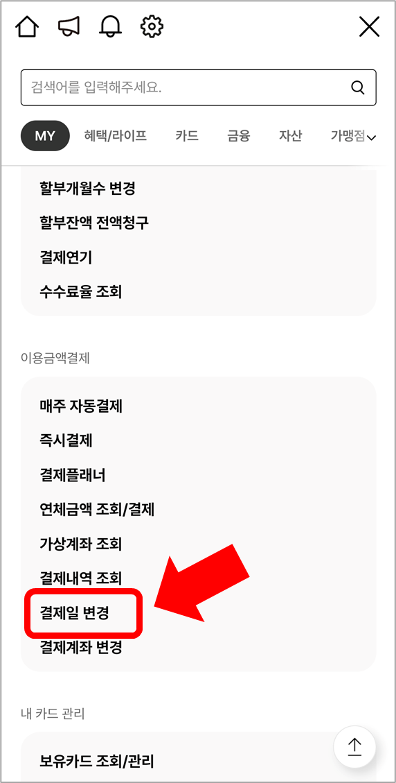 우리카드 앱에 로그인 한 뒤 메인화면 오른쪽 위에 있는 [전체메뉴]에서 [이용금액결제] 메뉴의 [결제일 변경]을 선택합니다.
