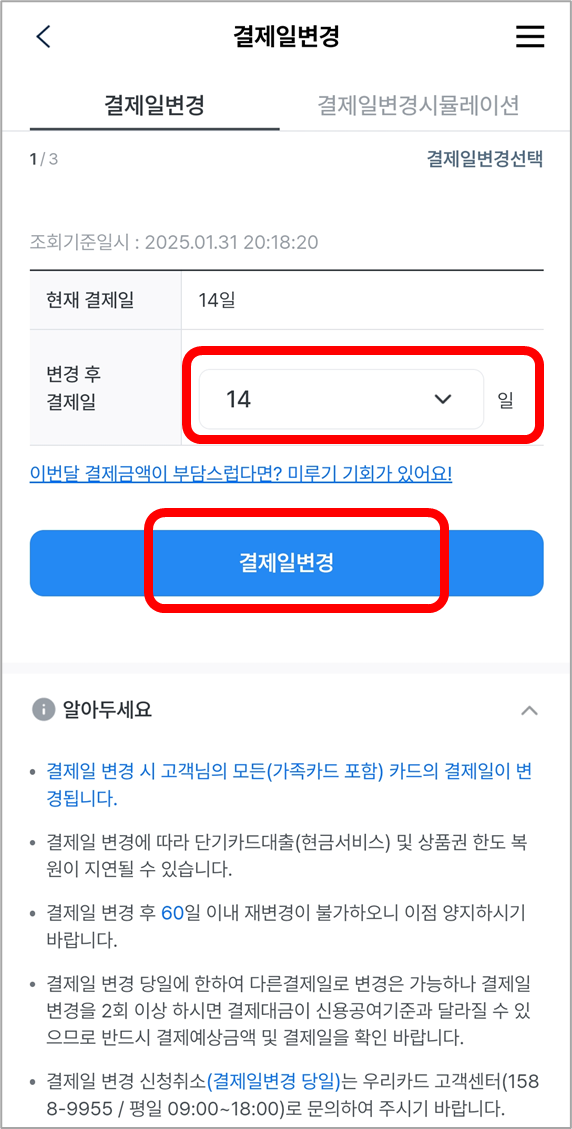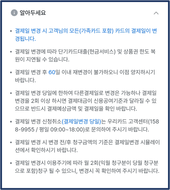결제일 변경 시 주의사항결제일을 변경하고 나면 60일 이내 재변경할 수 없으니, 이를 주의하시기 바랍니다.
