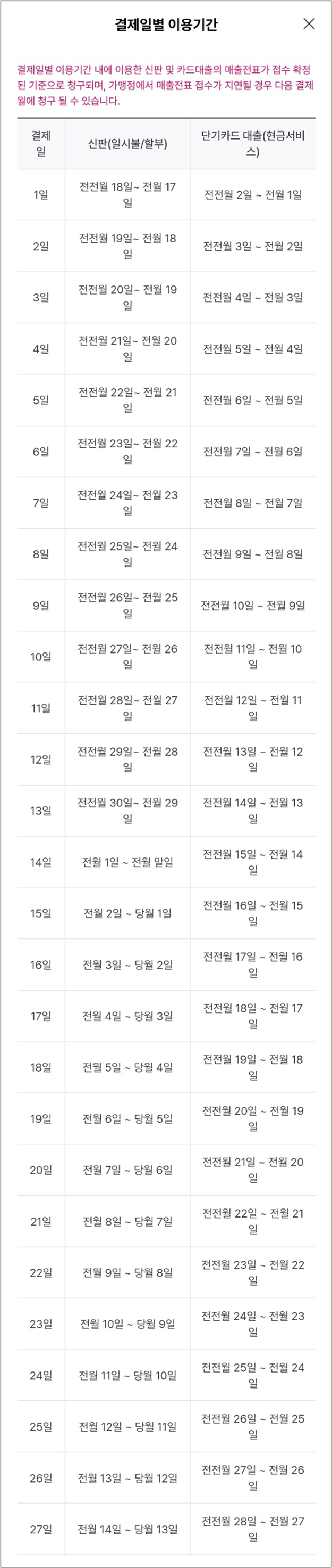 모든 신용카드는 사용자의 편의에 따라 결제일을 지정할 수 있습니다. 다만 결제일마다 이용기간이 다르게 적용되니 본인의 월급날 등을 고려하여 결제일을 결정해야 합니다.