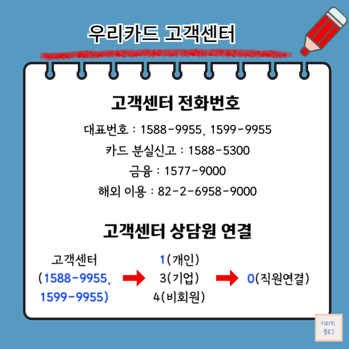 우리카드 고객센터의 대표 전화번호는 1588-9955 또는 1599-9955 입니다.