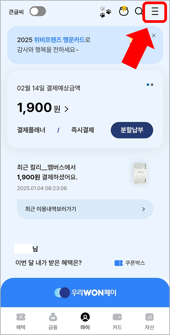 우선 우리카드 앱에 로그인한 뒤 오른쪽 위에 있는 [전체메뉴]를 선택합니다.