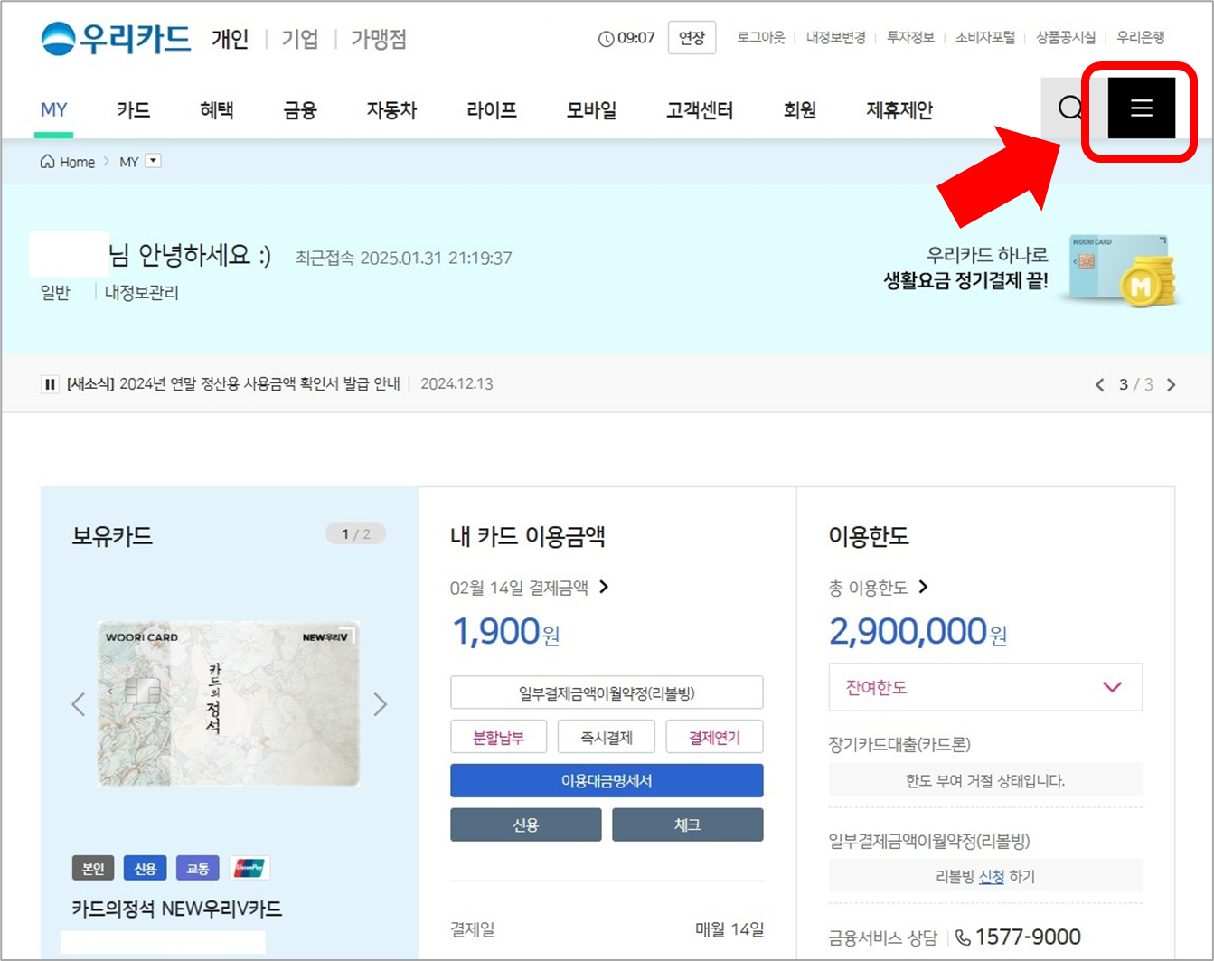 우리카드 홈페이지에 로그인한 뒤 [전체메뉴]를 클릭합니다.