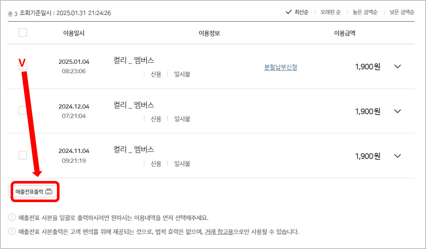 매출전표가 필요한 결제 건을 선택하고 아래의 [매출전표출력] 버튼을 클릭합니다.