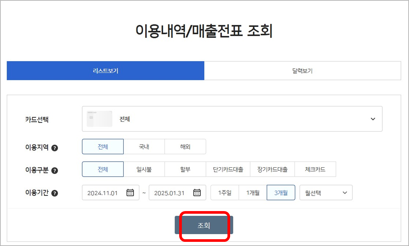 [카드이용내역] 메뉴에서 [이용내역/매출전표 조회]를 클릭합니다.