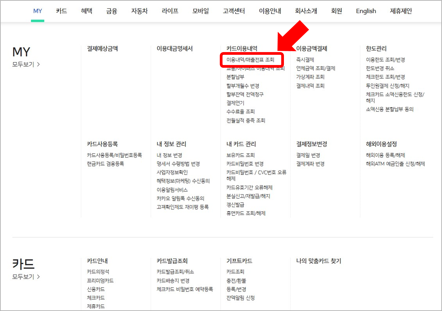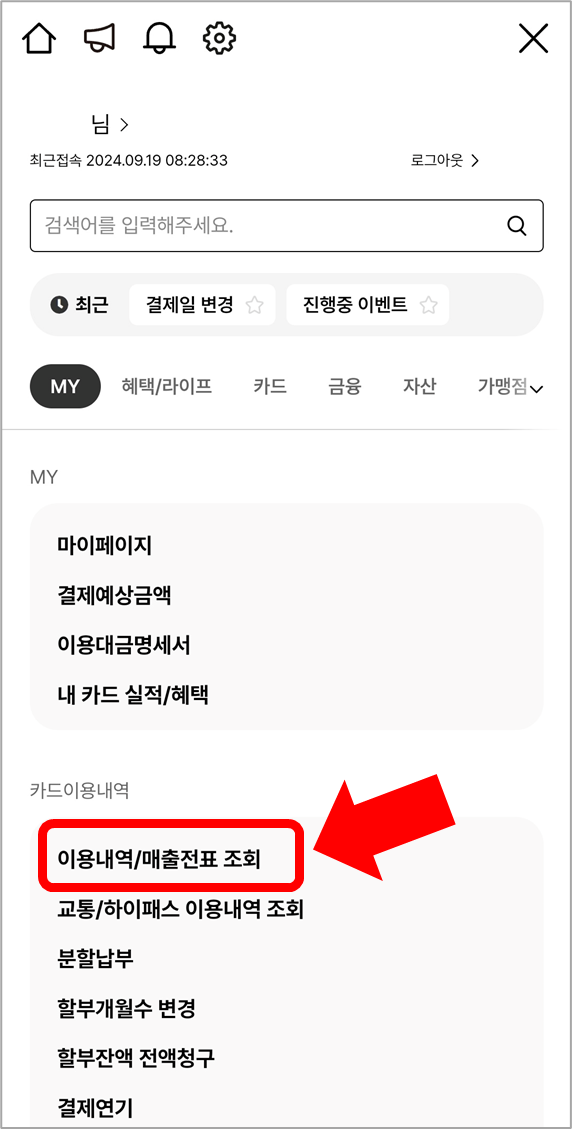 그리고 전체메뉴 중에서 [카드이용내역]의 [이용내역/매출전표 조회]를 선택합니다.