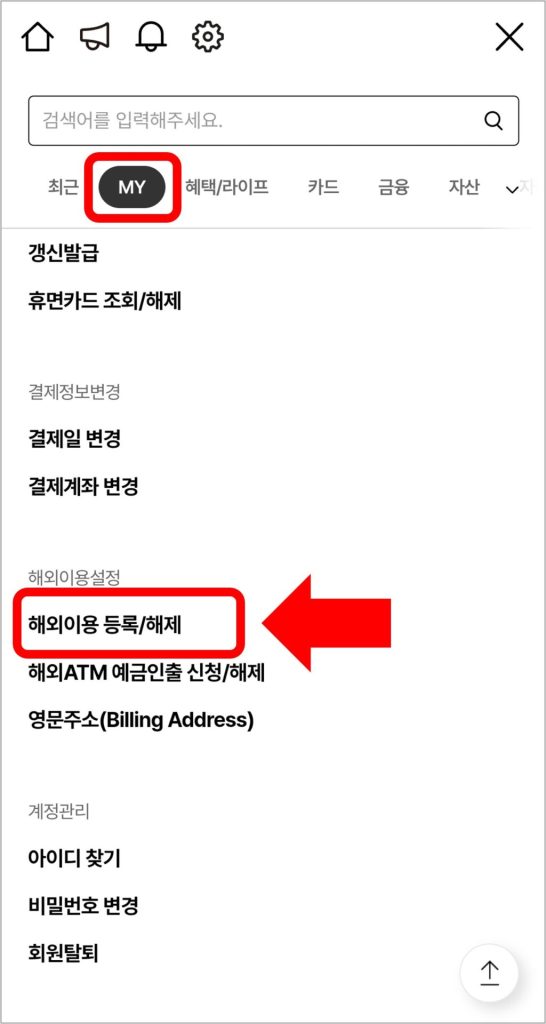 [MY → 해외이용설정 → 해외이용 등록/해제]를 선택합니다.
