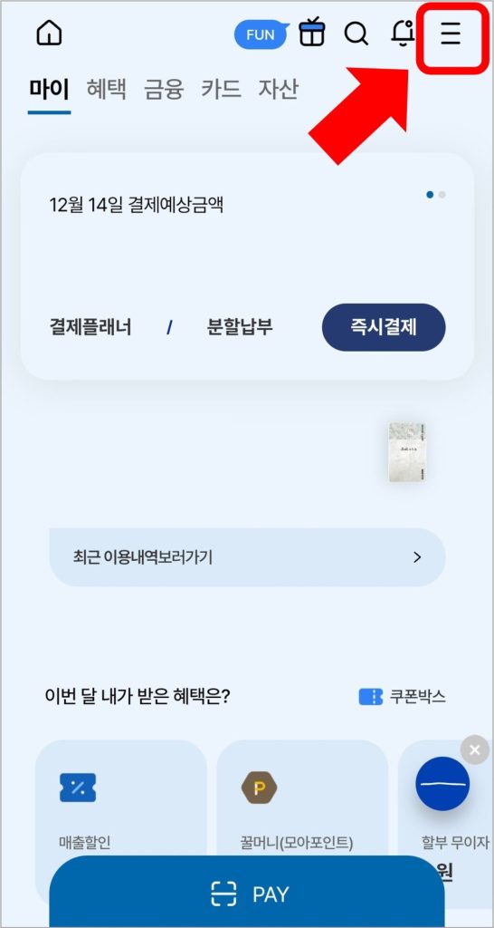 우리카드 앱의 메인화면 오른쪽 위에 있는 전체메뉴 버튼을 선택합니다.
