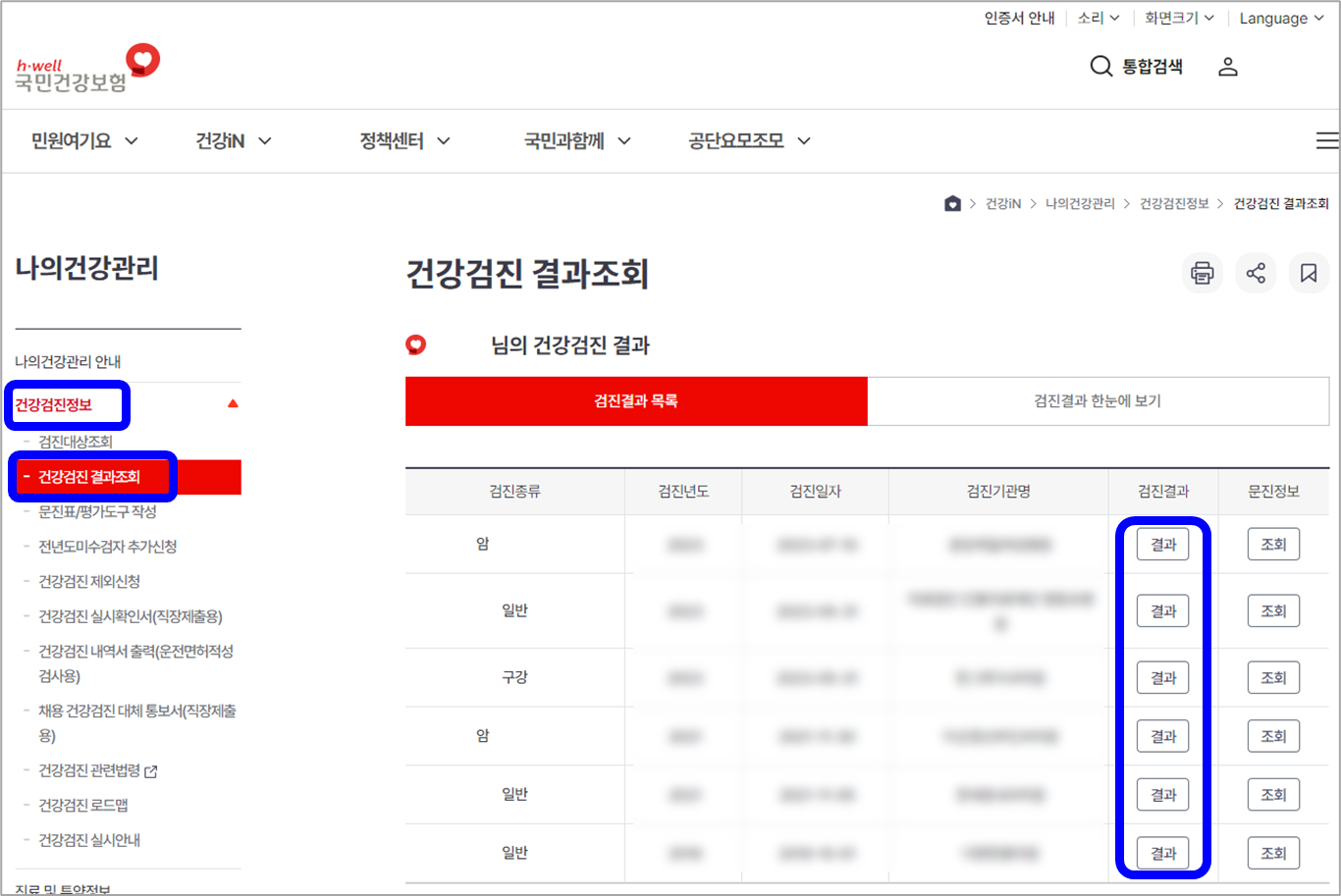 건강보험공단 건강검진자료는 병원에서 건강검진을 받으면 대부분 자동으로 검진자료가 동기화됩니다. 건강보험공단 홈페이지 아래와 같이 확인할 수 있습니다.