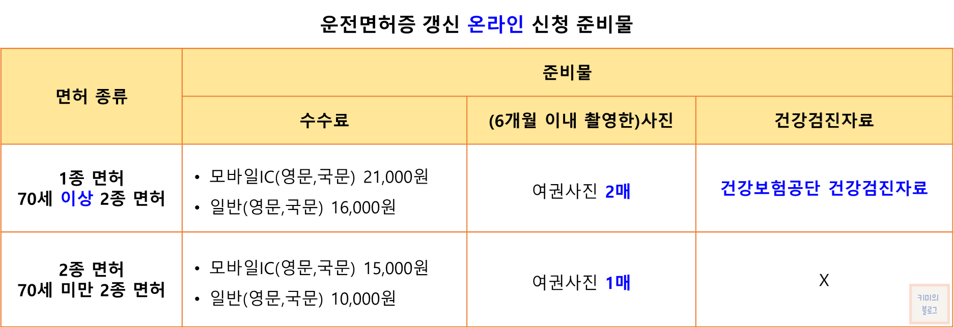 1종 면허의 경우 적성검사를 필수로 받아야 하기 때문에 온라인 갱신을 위해서는 건강보험공단 건강검진자료가 필요합니다. 수수료는 모바일 IC 면허증 21,000원, 일반면허증 16,000원입니다.