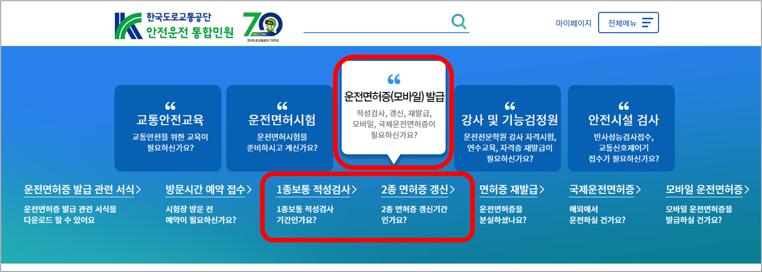 홈페이지 메인 화면에서 가운데에 있는 [운전면허증(모바일) 발급]을 선택한 뒤, 1종 또는 2종 중 본인의 면허에 따라 선택하시면 됩니다.