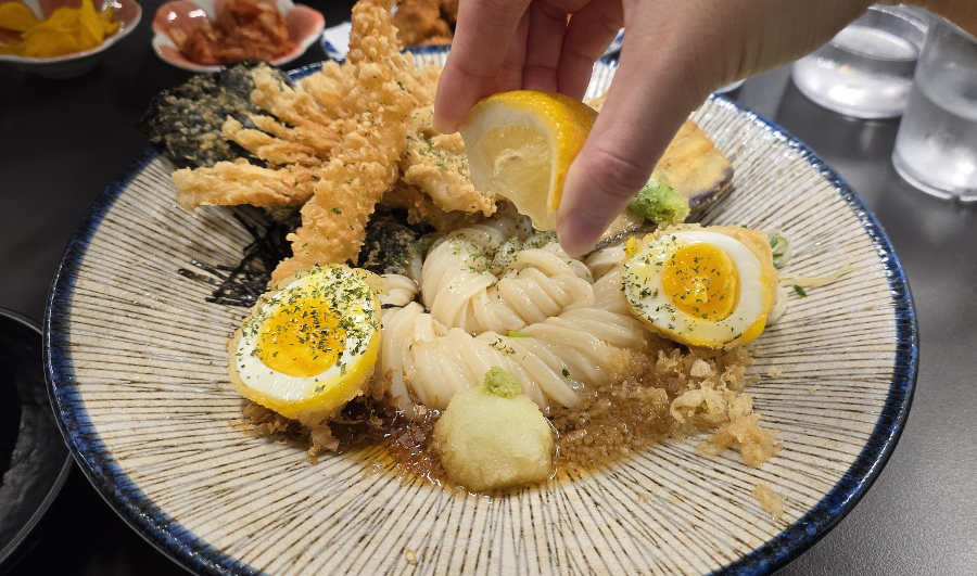 튀김은 앞접시에 덜어두고, 면발에 레몬즙을 뿌려서 튀김을 하나씩 곁들여서 먹으면 됩니다.