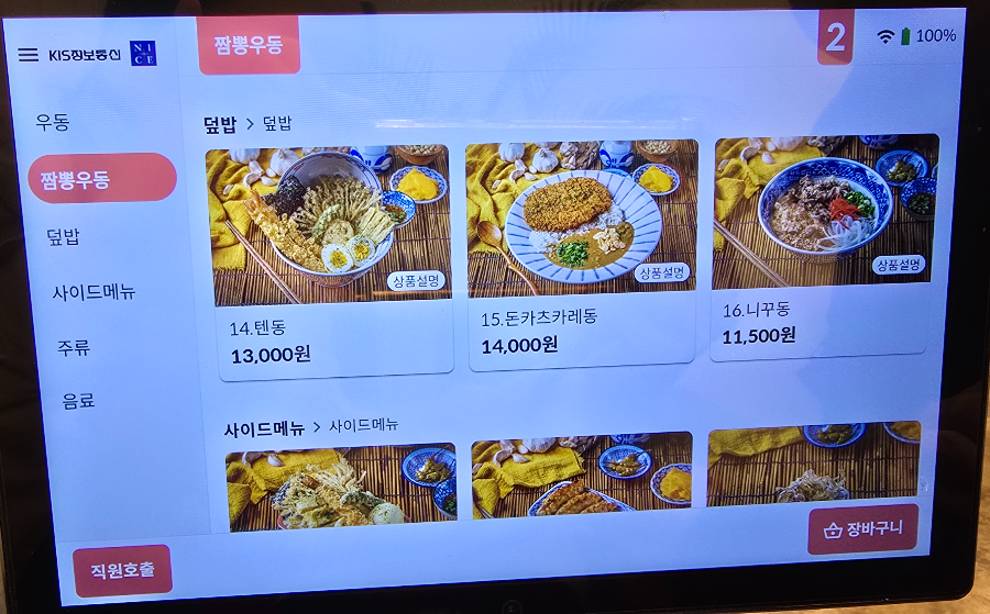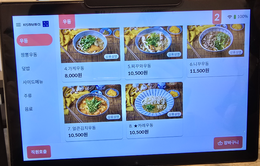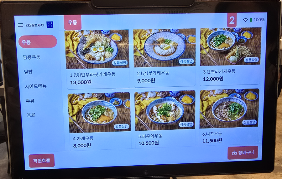 우동은 냉 덴뿌라 붓가케우동, 냉 붓가케우동, 덴뿌라 가케우동, 가케우동, 찌꾸와우동, 니꾸우동, 얼큰김치우동, 카레우동이 있습니다.