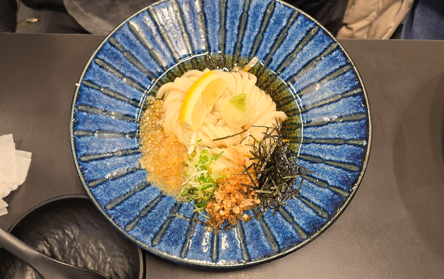 이건 일행이 주문한 냉붓가케우동입니다. 우동의 순수한 맛과 면발에 집중하고 싶다면 냉붓가케 우동을 주문하시는 것도 좋습니다.