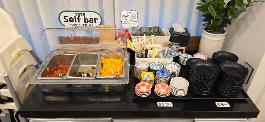 셀프바에는 김치, 고추장아찌, 단무지 등 기본 반찬과 앞접시, 가위, 집게 등 식기가 있었습니다.