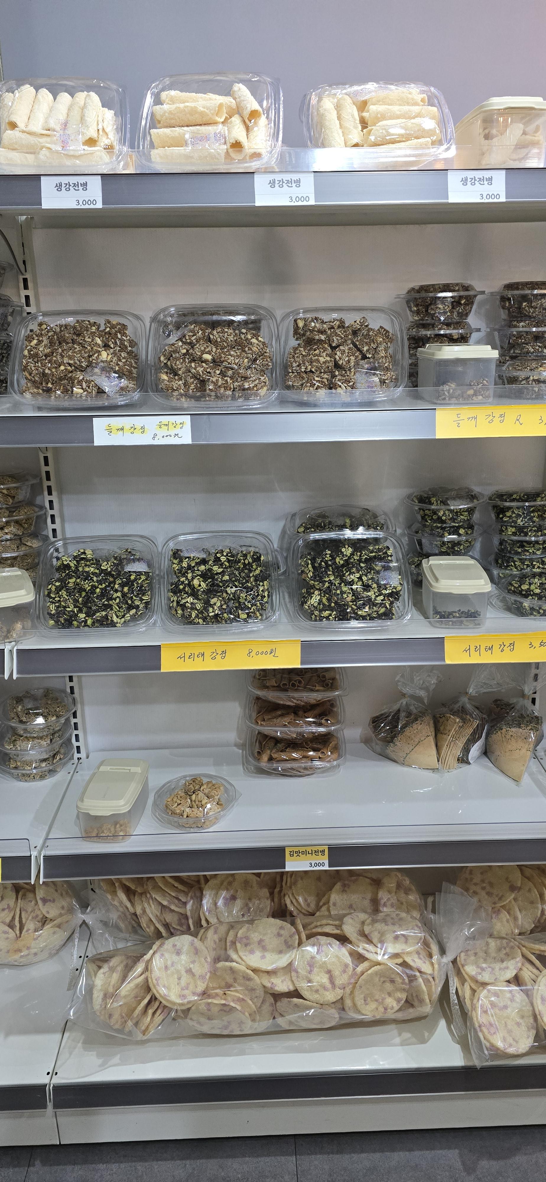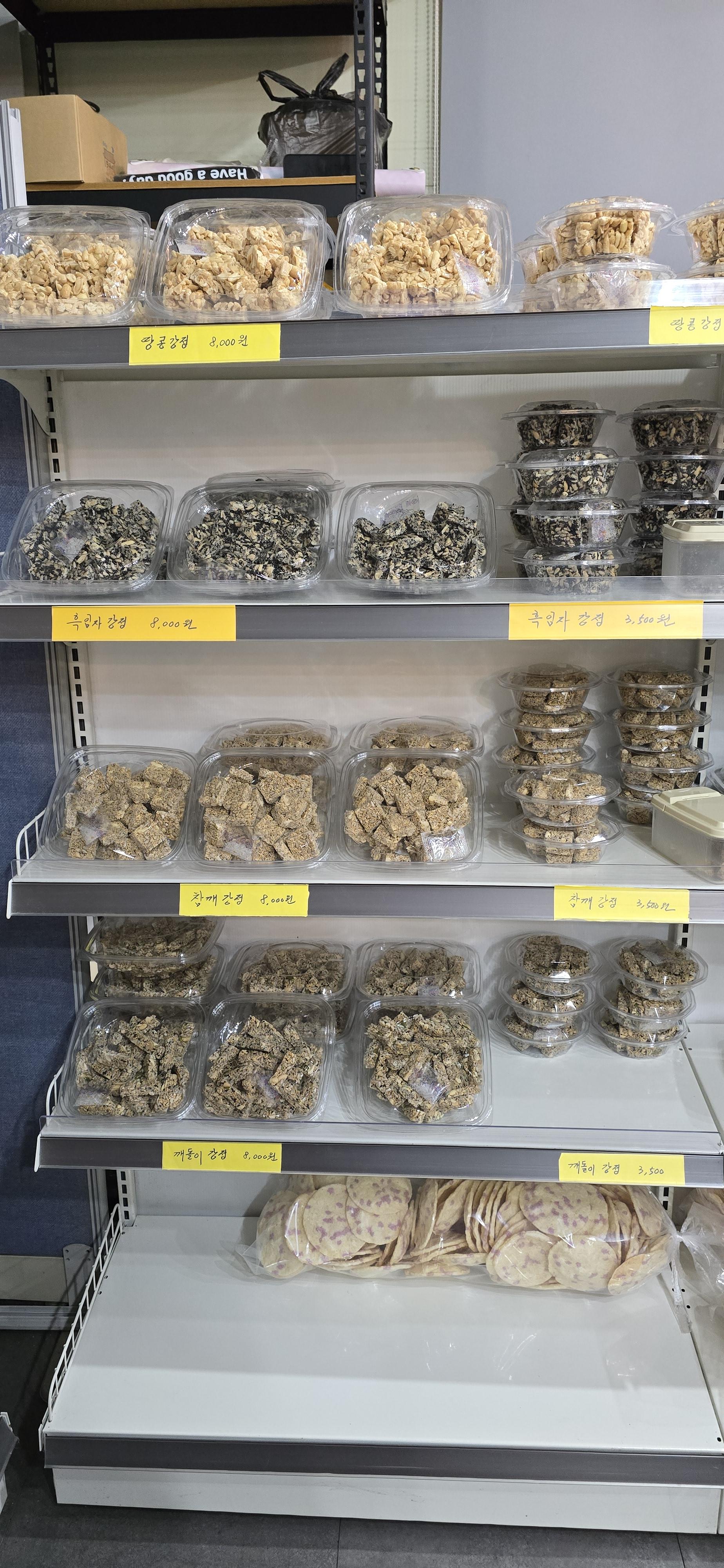 서리태강정, 참깨강정, 들깨강정, 땅콩강정, 흑임자강정에, 여러 가지 견과류를 섞은 깨돌이 강정도 있었습니다.