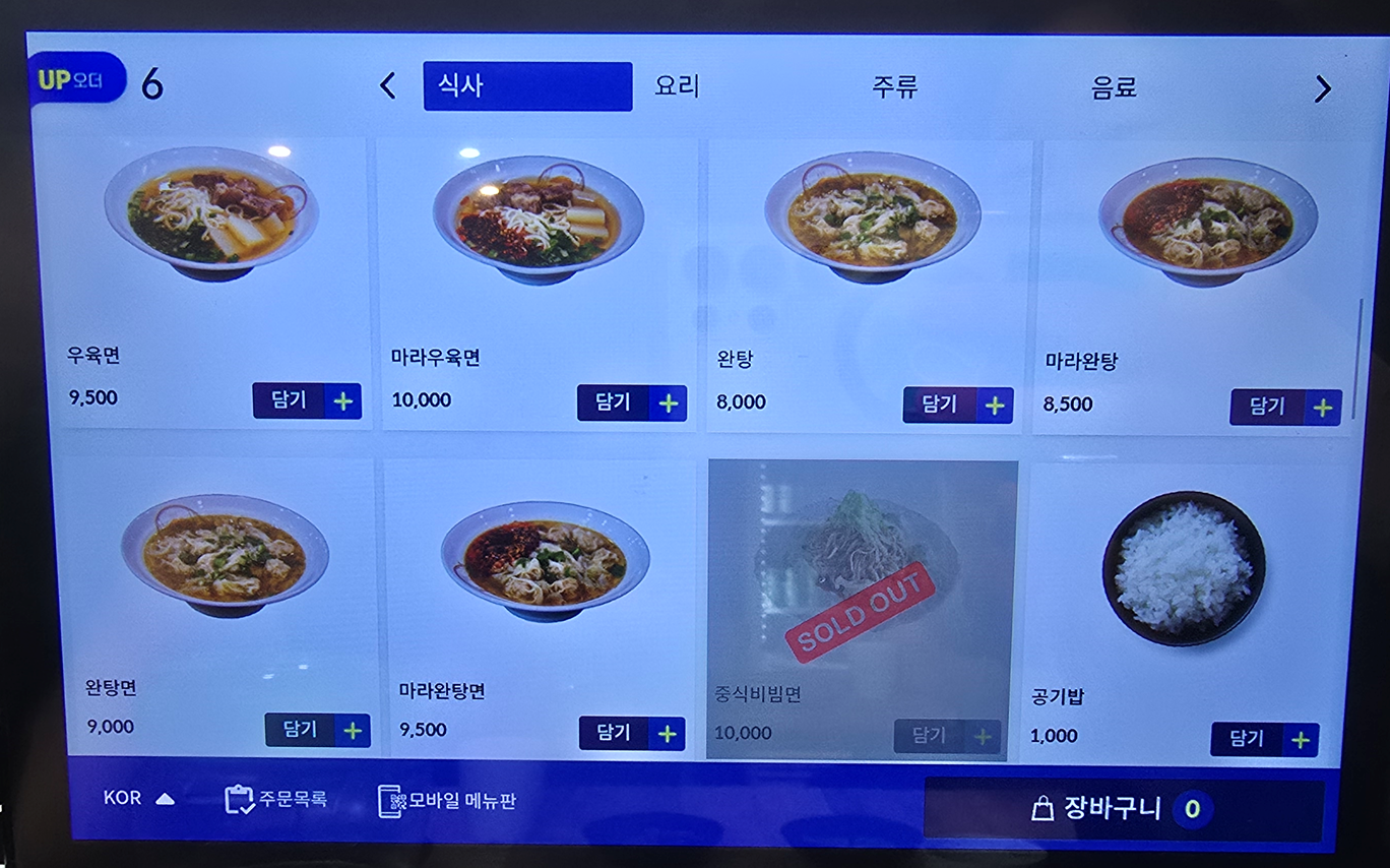 식사 메뉴는 우육면, 완탕, 완탕면 세 가지가 있고 각각 마라 맛 베리에이션이 있습니다.