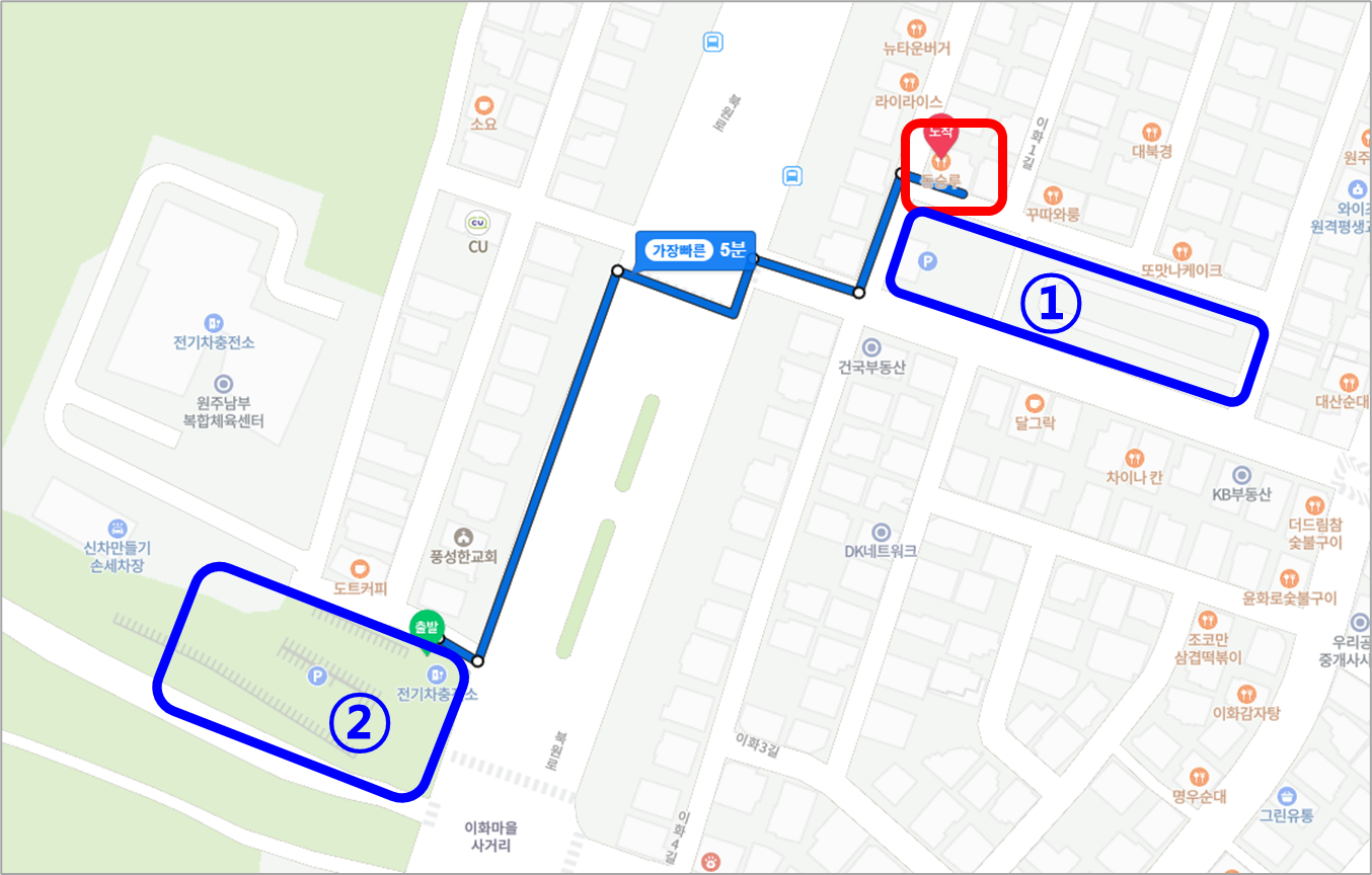 하지만 주택가라서 만차일 때가 많은데, 그럴 때는 큰길 건너편에 있는 ②번 주차장을 이용하시면 됩니다.