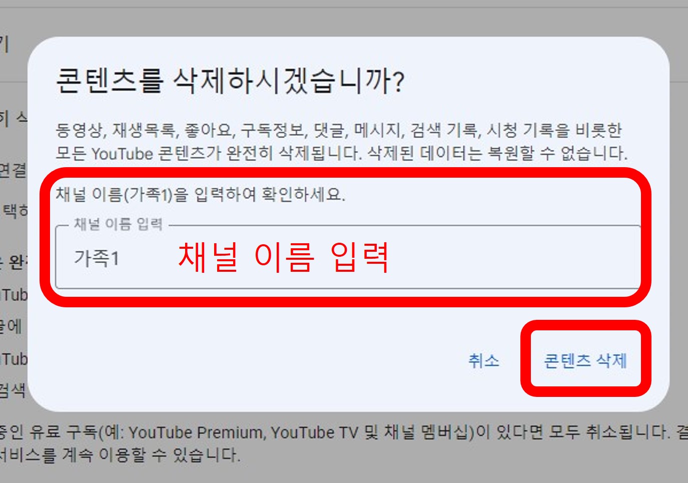 6. 삭제하려는 채널의 이름을 입력한 후 콘텐츠 삭제를 클릭하면 삭제가 완료됩니다. 삭제 후에는 채널을 복구할 수 없으므로 주의하시기 바랍니다.