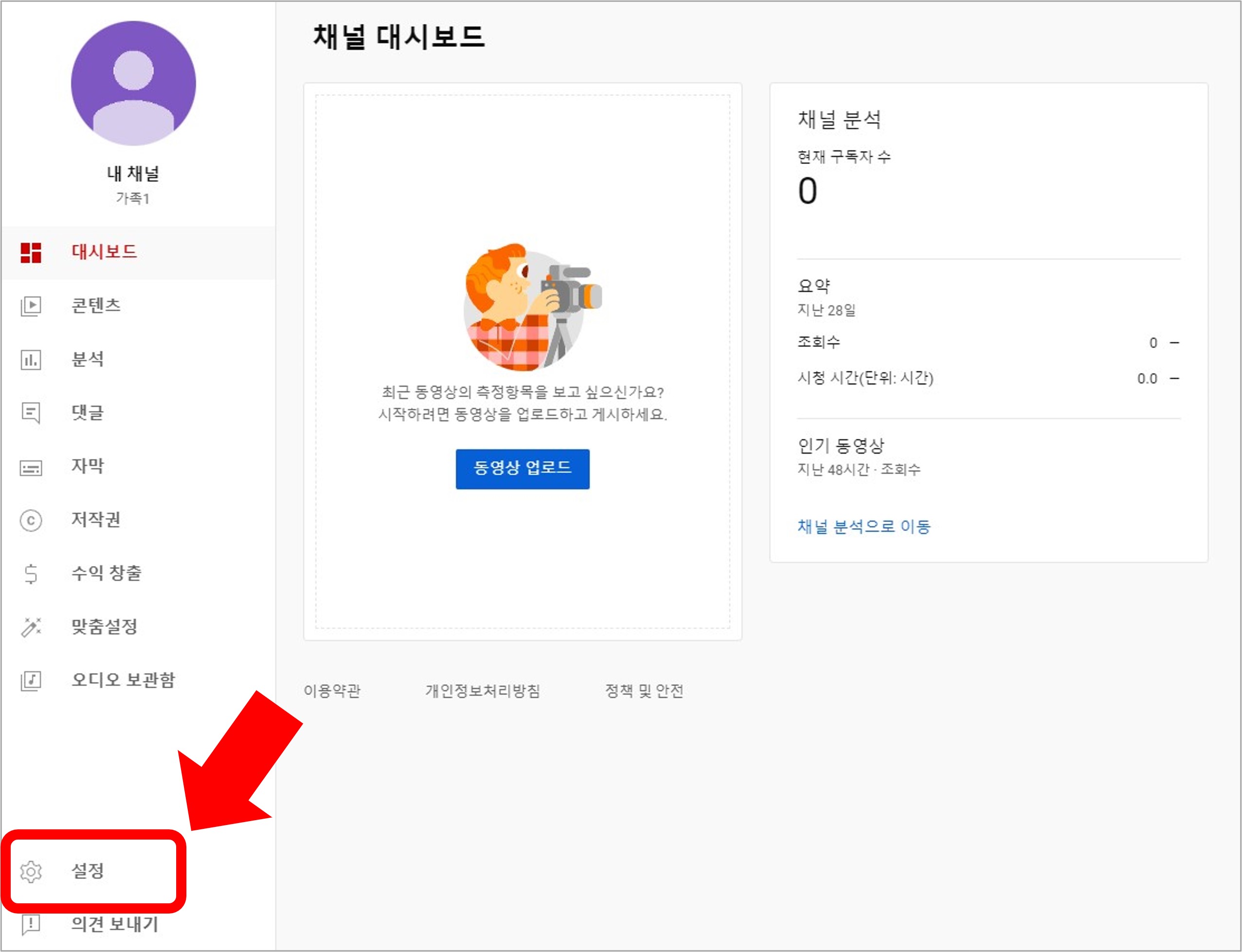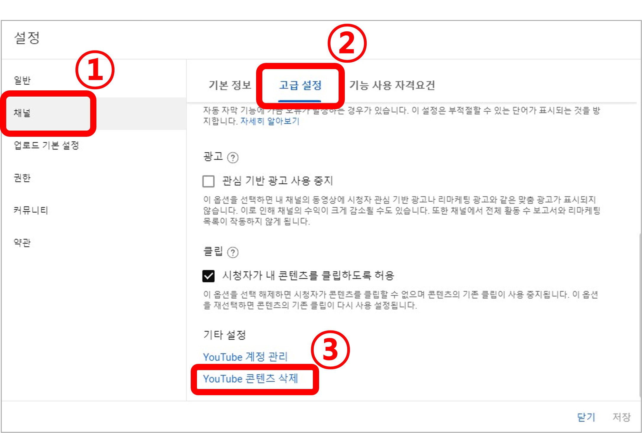 3. 설정에서 채널 > 고급 설정 > 유튜브 콘텐츠 삭제 순으로 클릭합니다.
