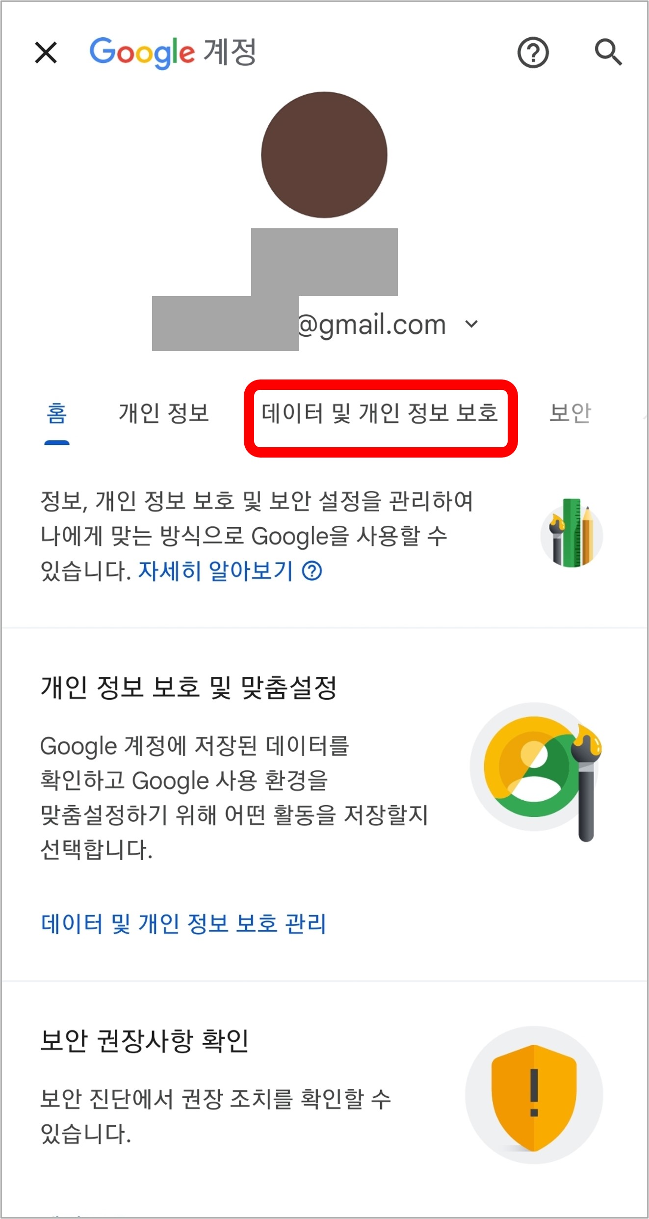 4. 계정 관리 페이지가 나타납니다. 여기에서 데이터 및 개인 정보 보호를 클릭한 후, 스크롤을 내려서 구글 서비스 삭제를 클릭합니다.