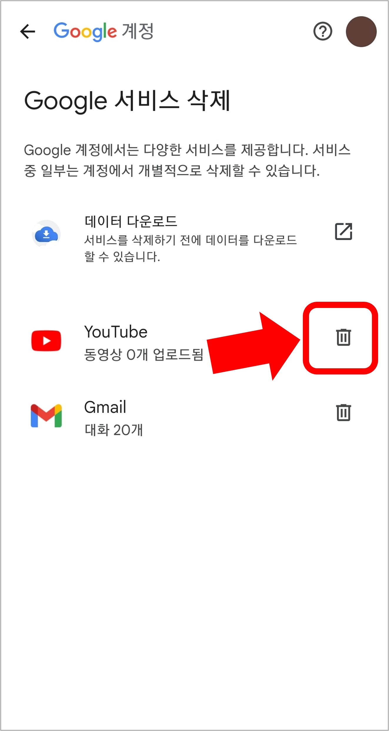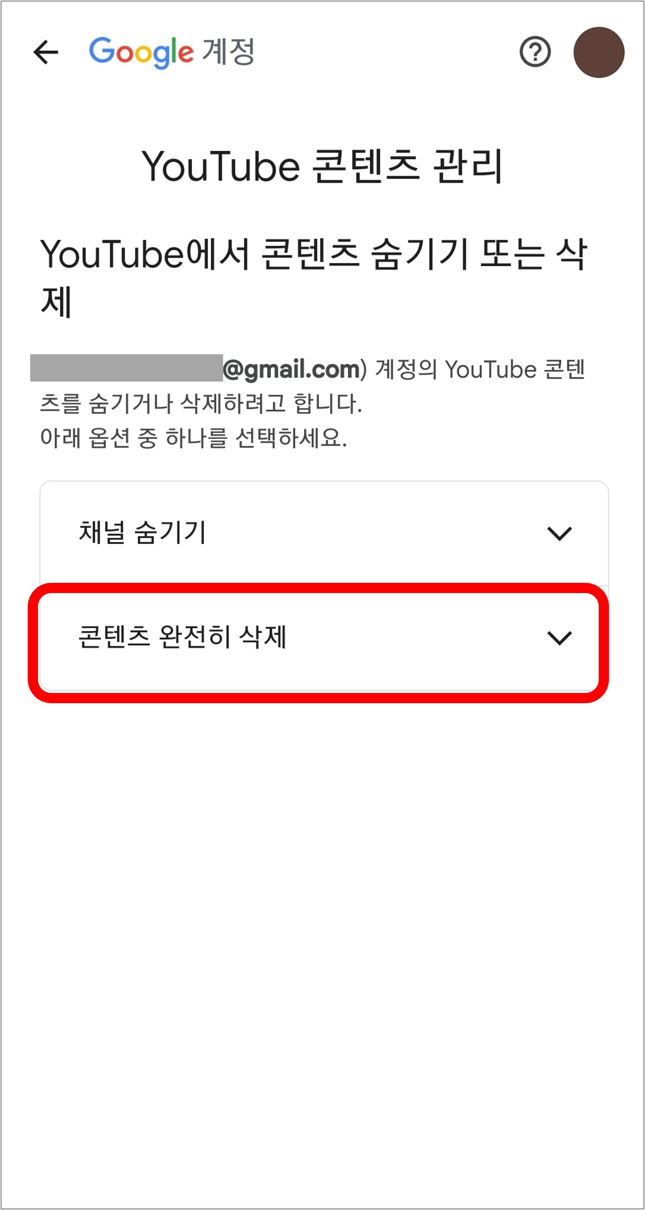 구글 계정 삭제를 선택하지 않도록 주의하시기 바랍니다.