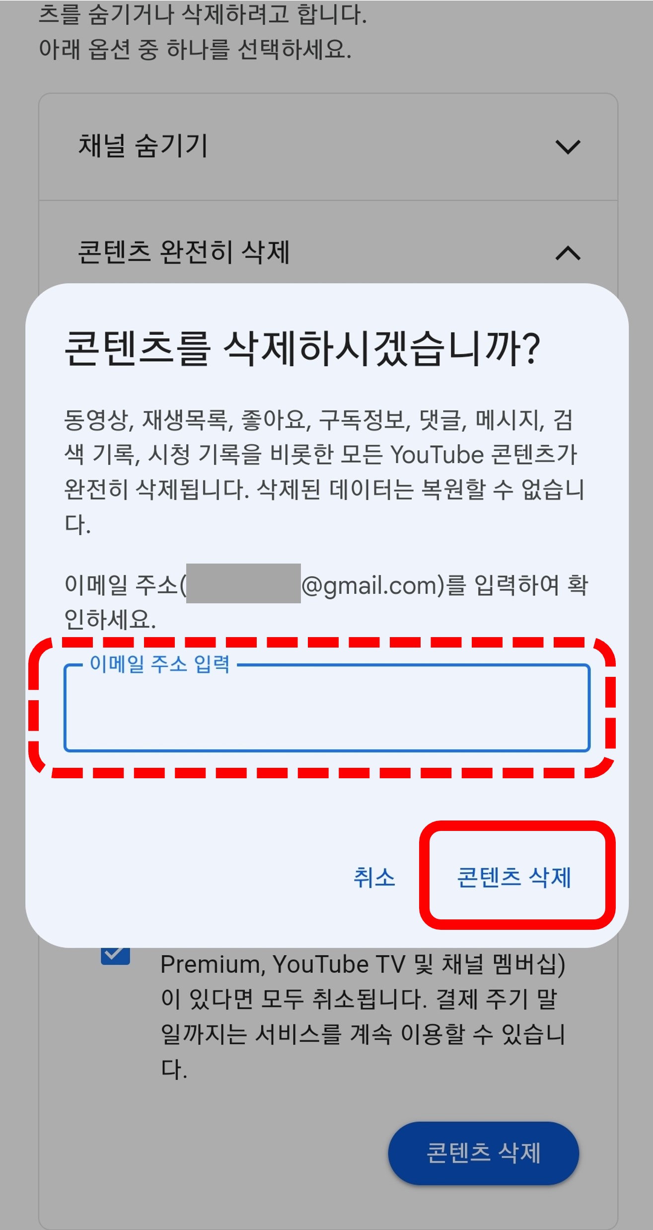 7. 마지막으로 구글 계정의 이메일 주소를 입력하고 콘텐츠 삭제를 클릭하면 채널이 완전히 삭제됩니다. 삭제된 채널은 복구가 불가능하니까 주의하시기 바랍니다.