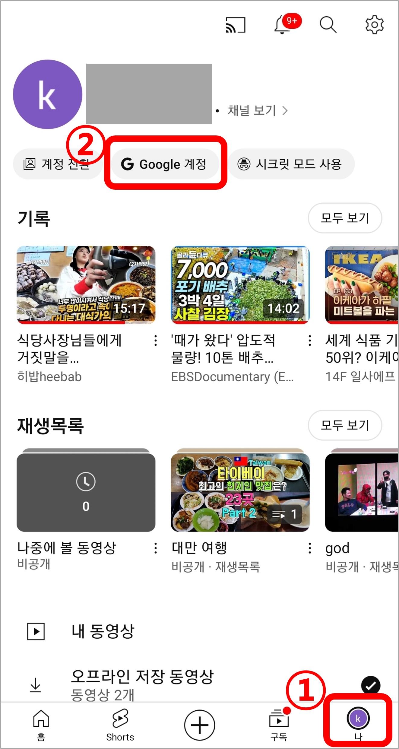 1. 유튜브 앱 오른쪽 하단에 프로필 아이콘을 클릭하고, 상단에서 구글 계정을 선택합니다.
