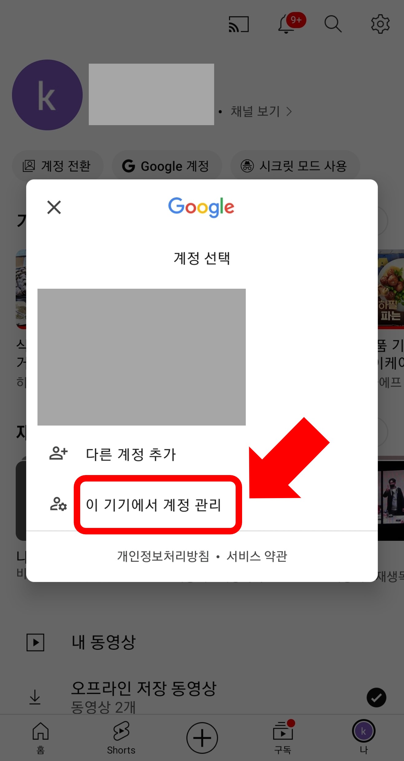 2. 팝업창에서 이 기기에서 계정 관리를 선택합니다. 휴대폰 기종에 따라 4번의 계정 관리 페이지로 바로 넘어갈 수도 있습니다.