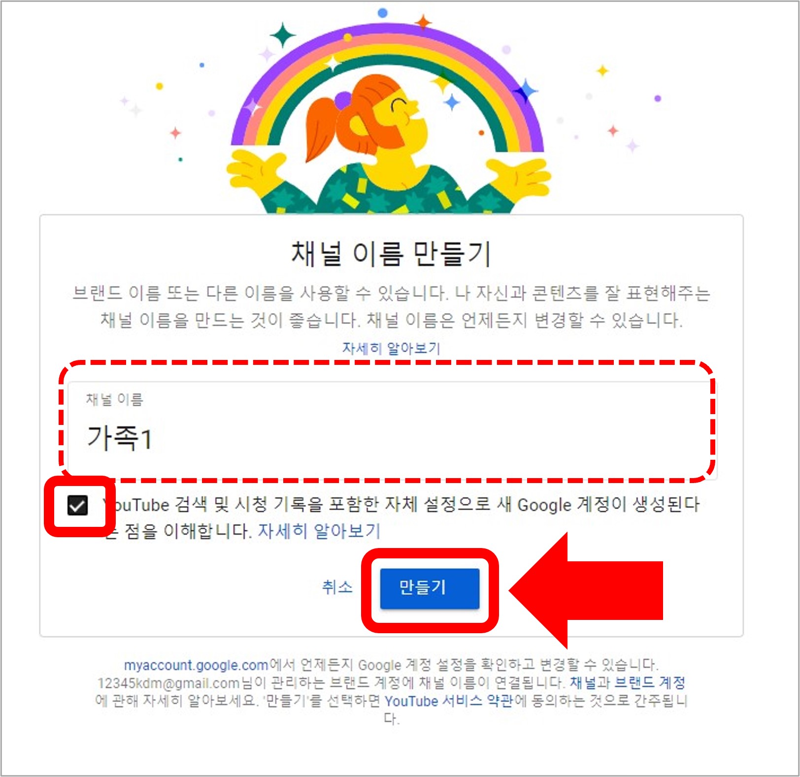 5. 원하는 채널 이름을 입력하고 만들기를 클릭합니다. 채널을 구분하기 편리하도록 가족 이름이나 호칭, 별명 등을 사용하시면 좋습니다.