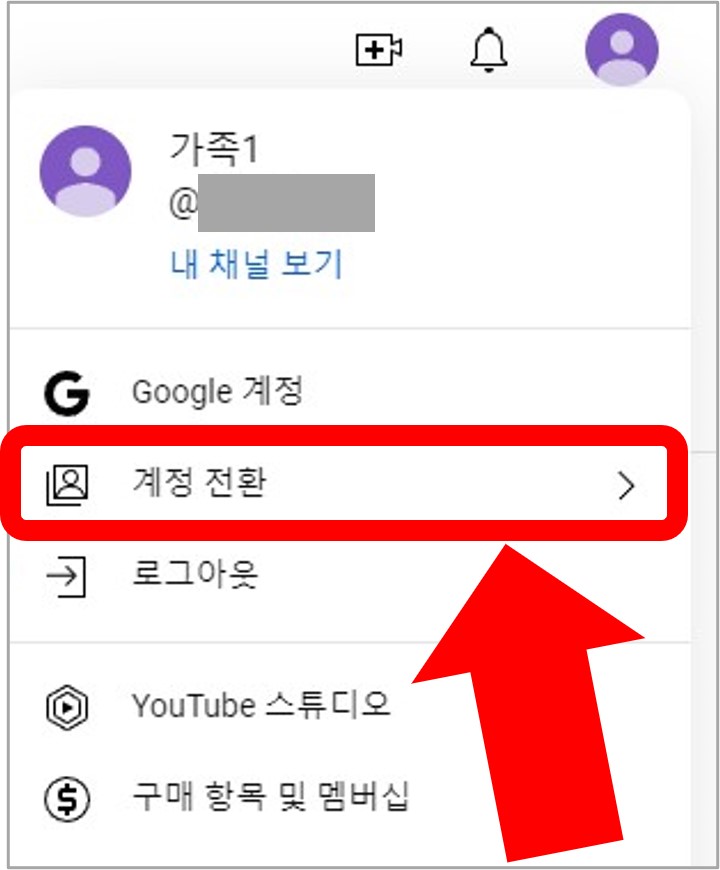 개설된 채널 확인 및 채널 변경은 오른쪽 상단의 프로필을 클릭하고, 계정 전환을 선택하여 원하는 채널을 클릭하면 됩니다.