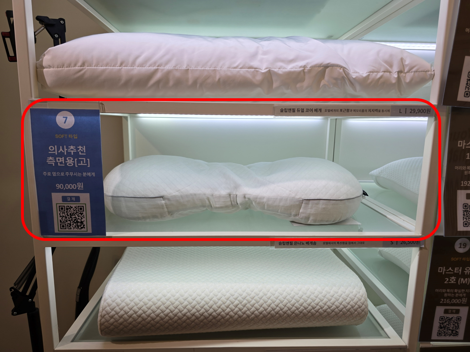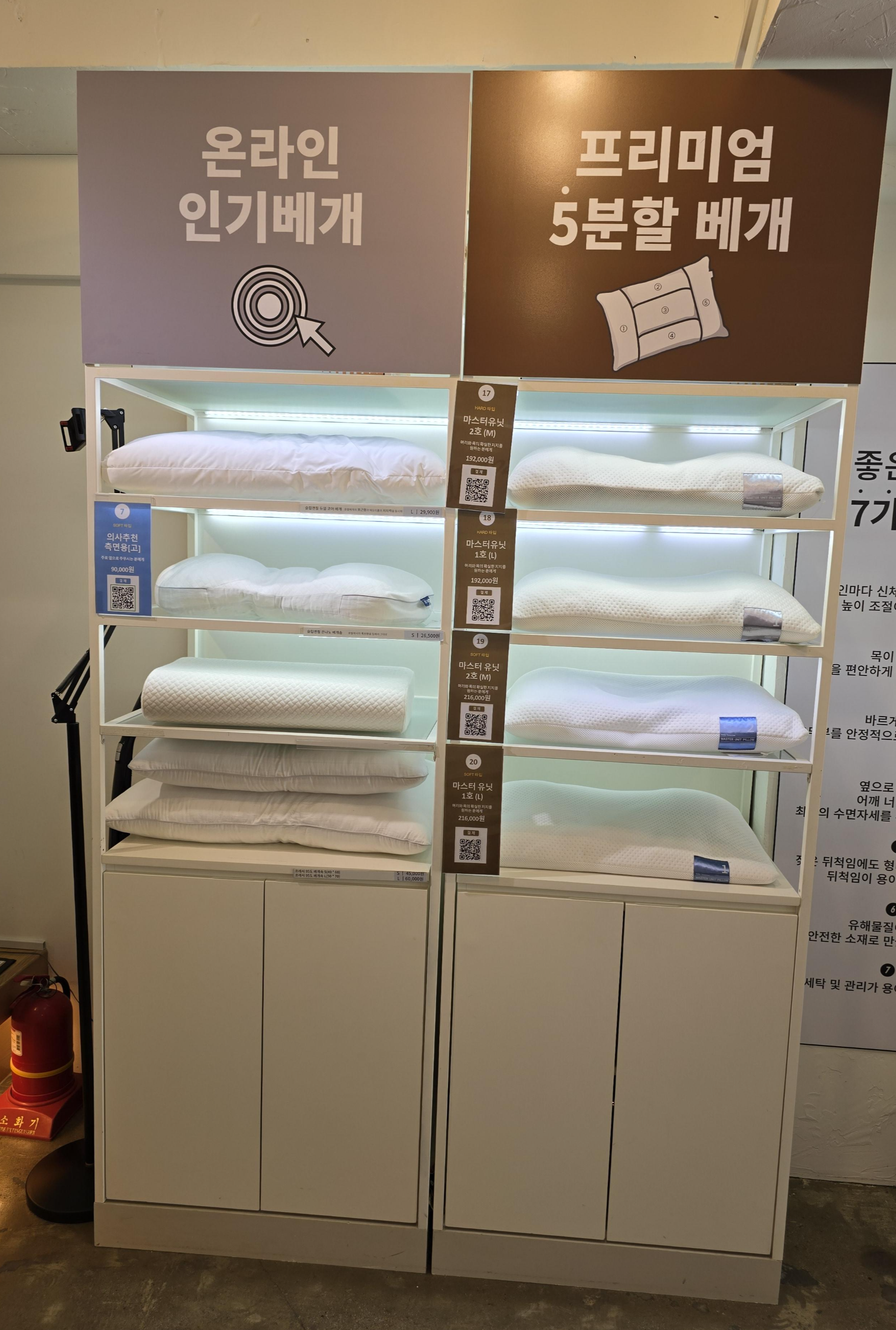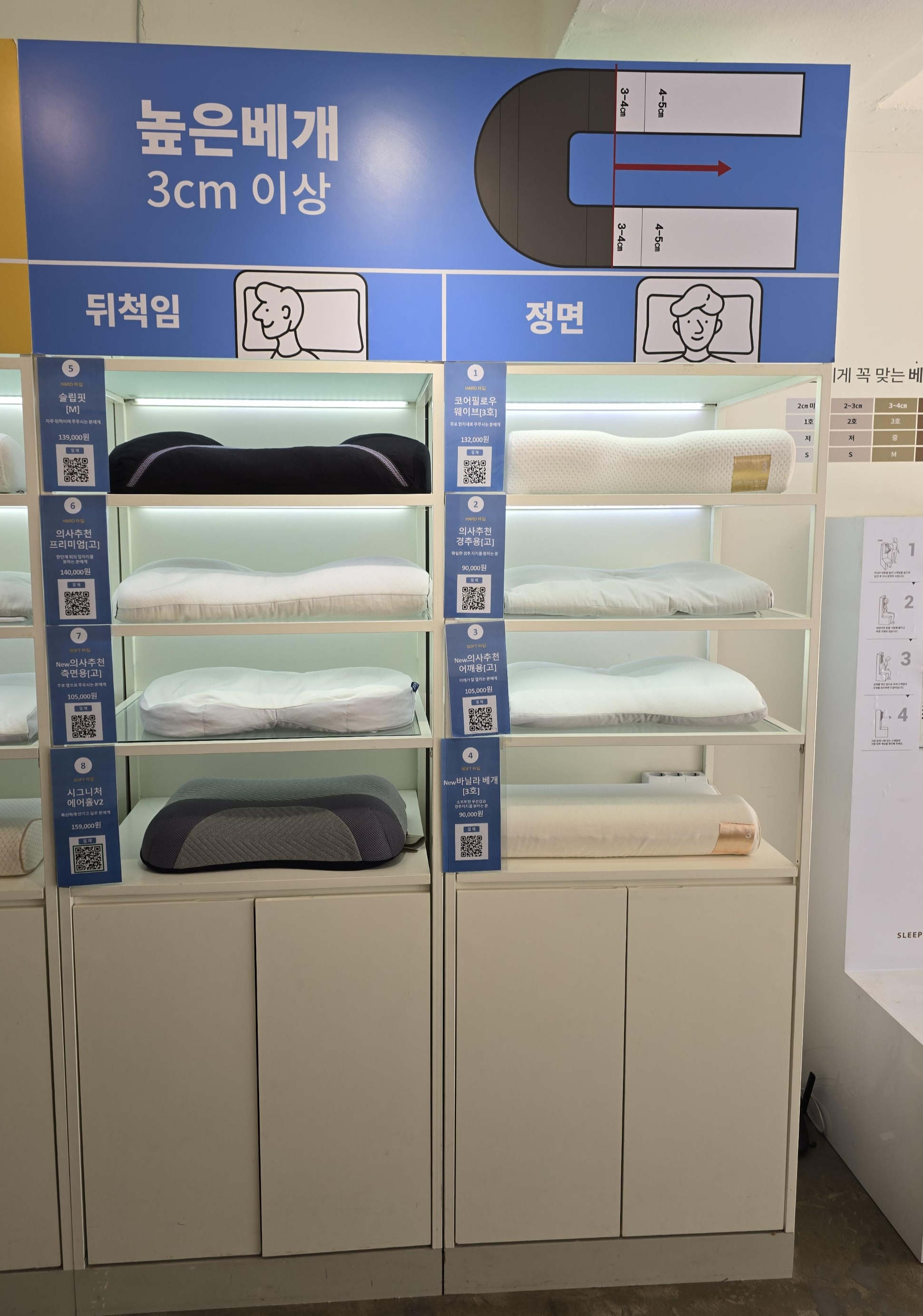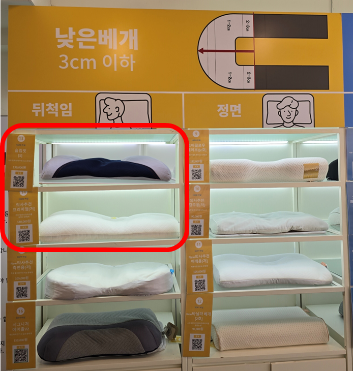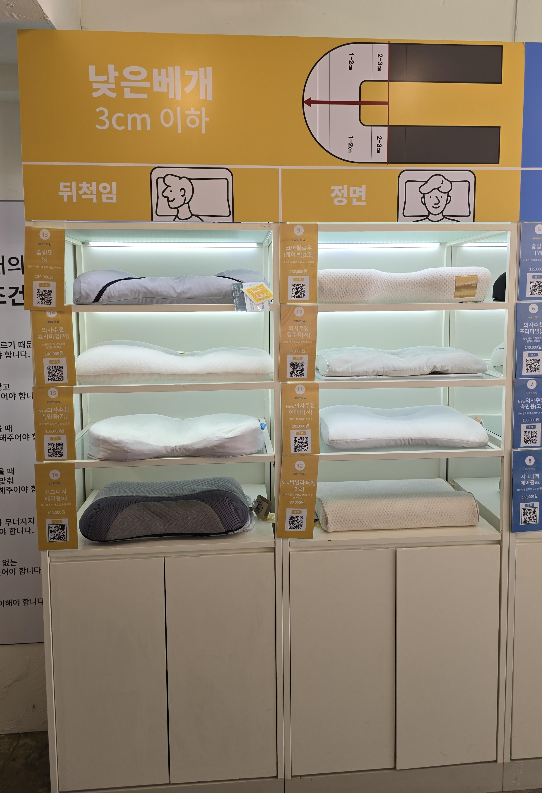 매장에는 경추 깊이(낮은 베개, 높은 베개), 수면 자세(뒤척임/정면), 베개의 경도(푹신한/단단한)에 따라 정말 다양한 베개들이 준비되어 있었습니다.