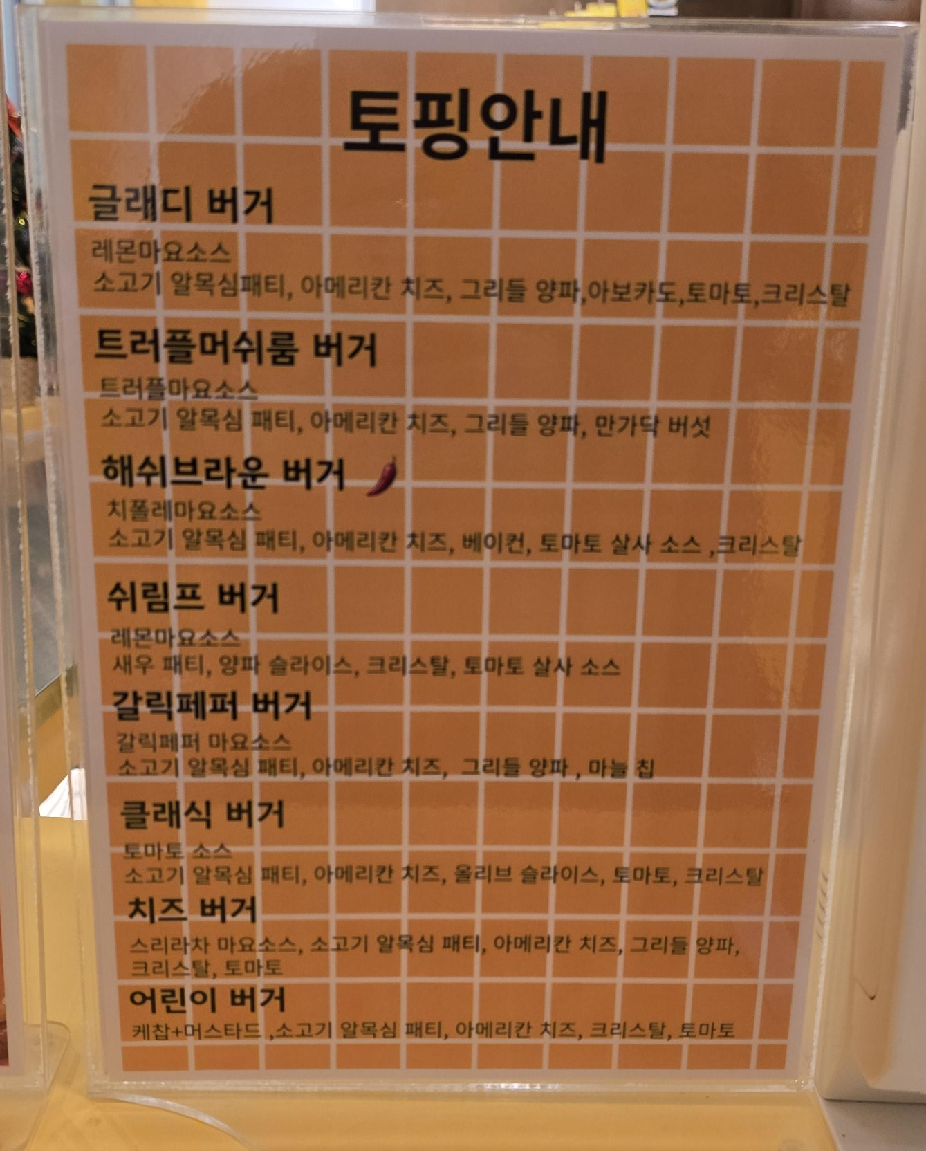 글래디 버거 메뉴