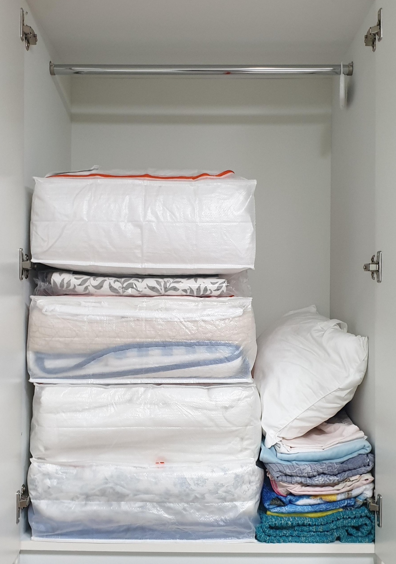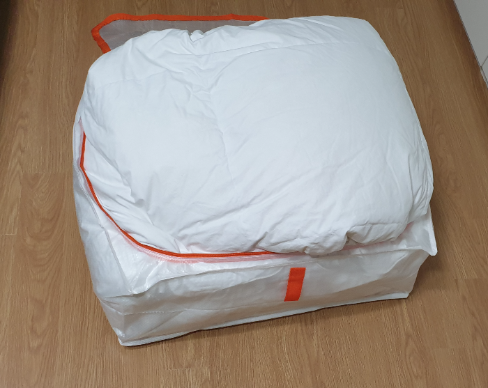 깔끔하게 들어간 모습입니다. 킹사이즈 오리털 이불은 하나 정도 넣을 수 있고요. 그 외에 이불 패드나 얇은 이불은 2~3개씩 넣을 수 있습니다.