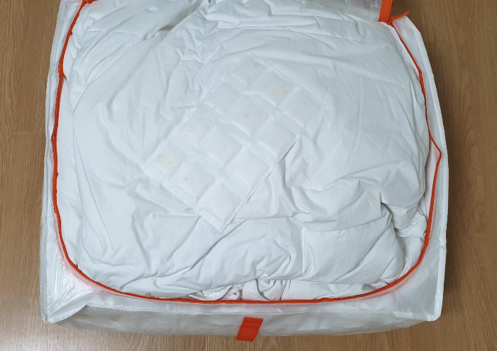 킹 사이즈 오리털 이불을 넣는 모습을 보여 드리겠습니다. 수납함의 두 배정도 되는 부피의 이불입니다.