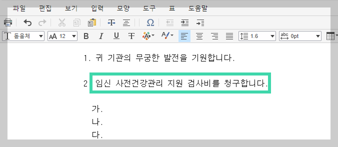 자동으로 작성된 서식에 아래와 같이 '임신 사전건강관지 지원을 신청합니다'라는 문구를 작성합니다.