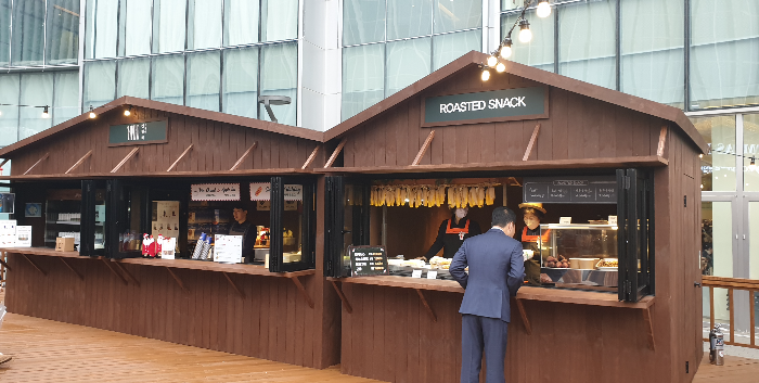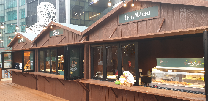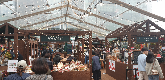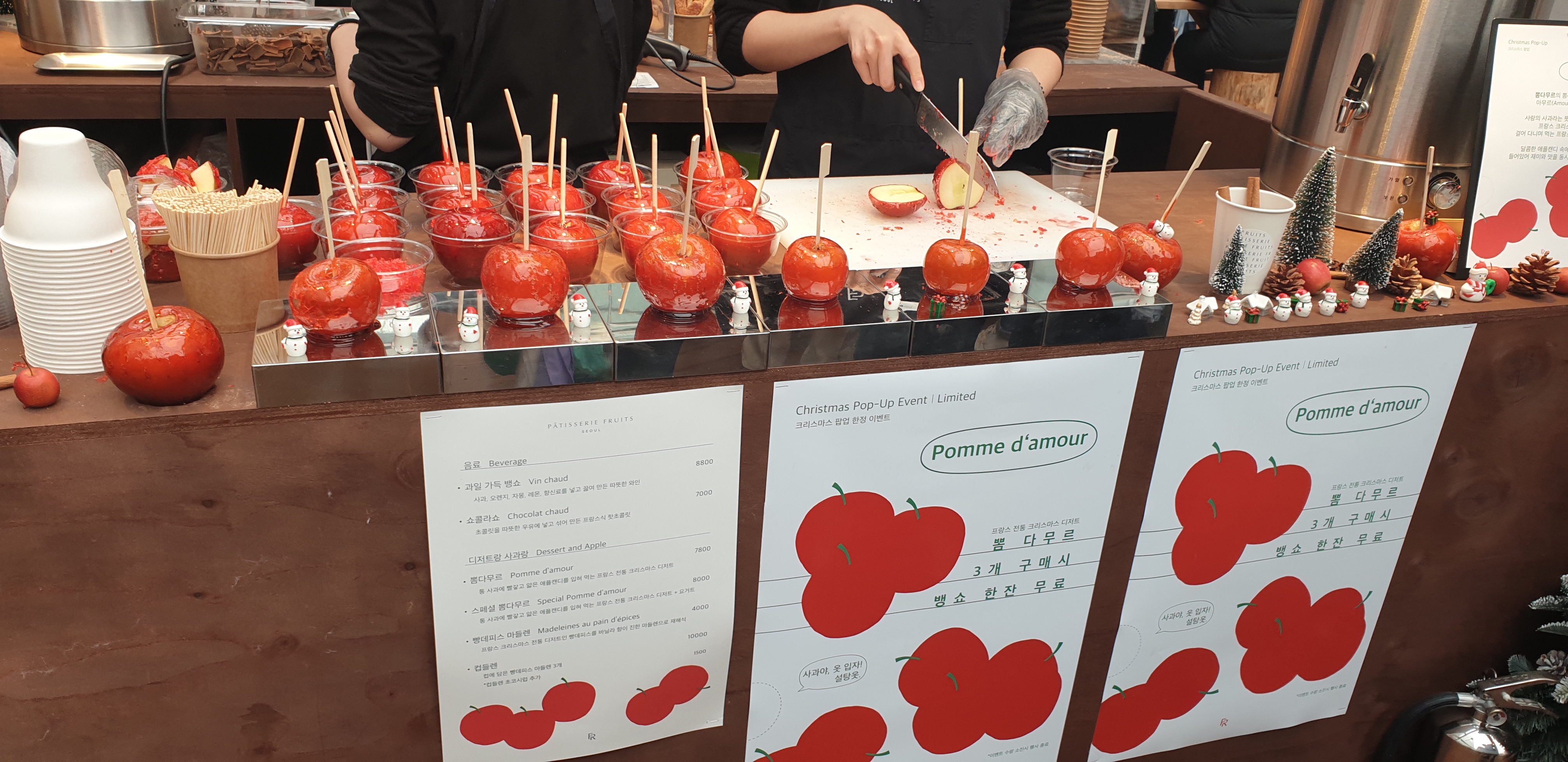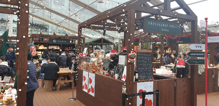 먹을거리로는 캔디사과, 러스크, 뱅쇼, 와인, 호박수프 등이 있고 유리온실 밖으로 나가면 쇼콜라쇼, 치즈, 어묵, 호두과자 등 더 다양한 음식들을 팔고 있습니다.