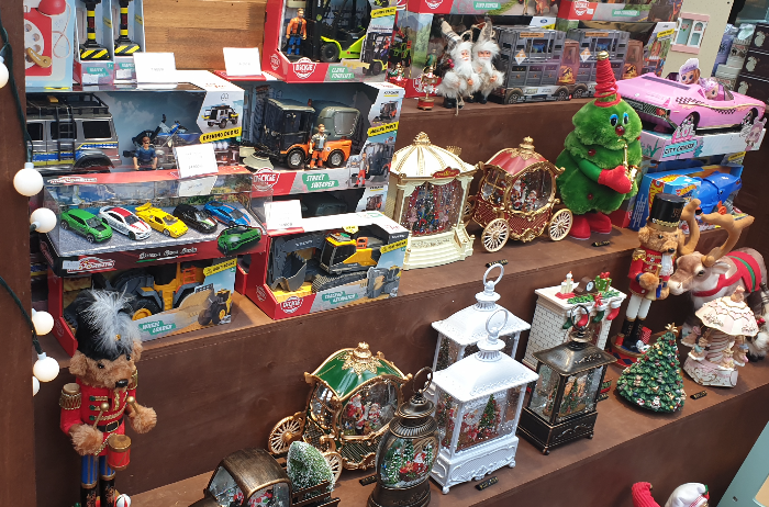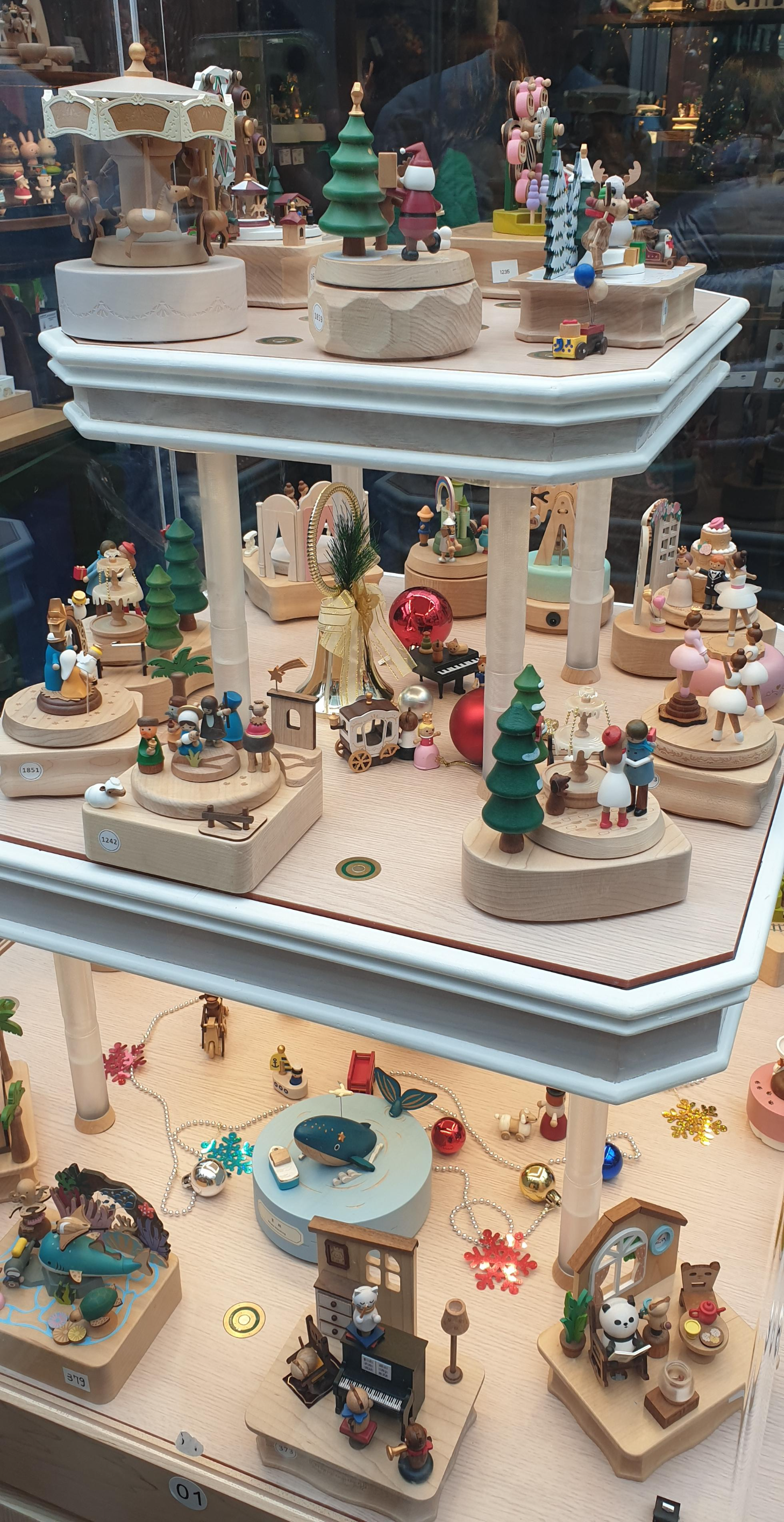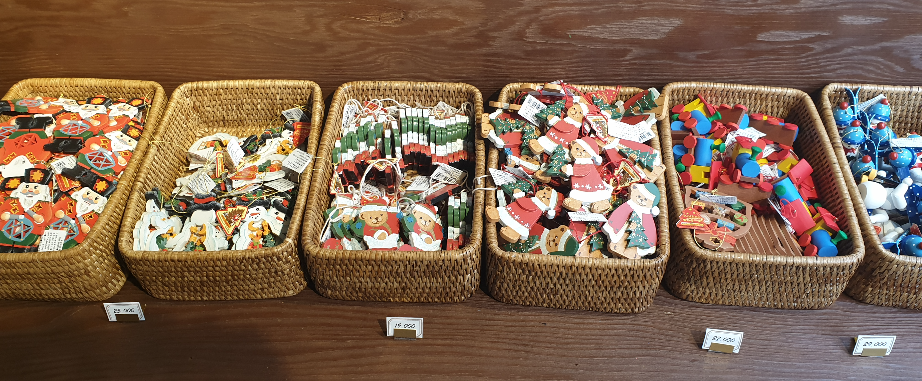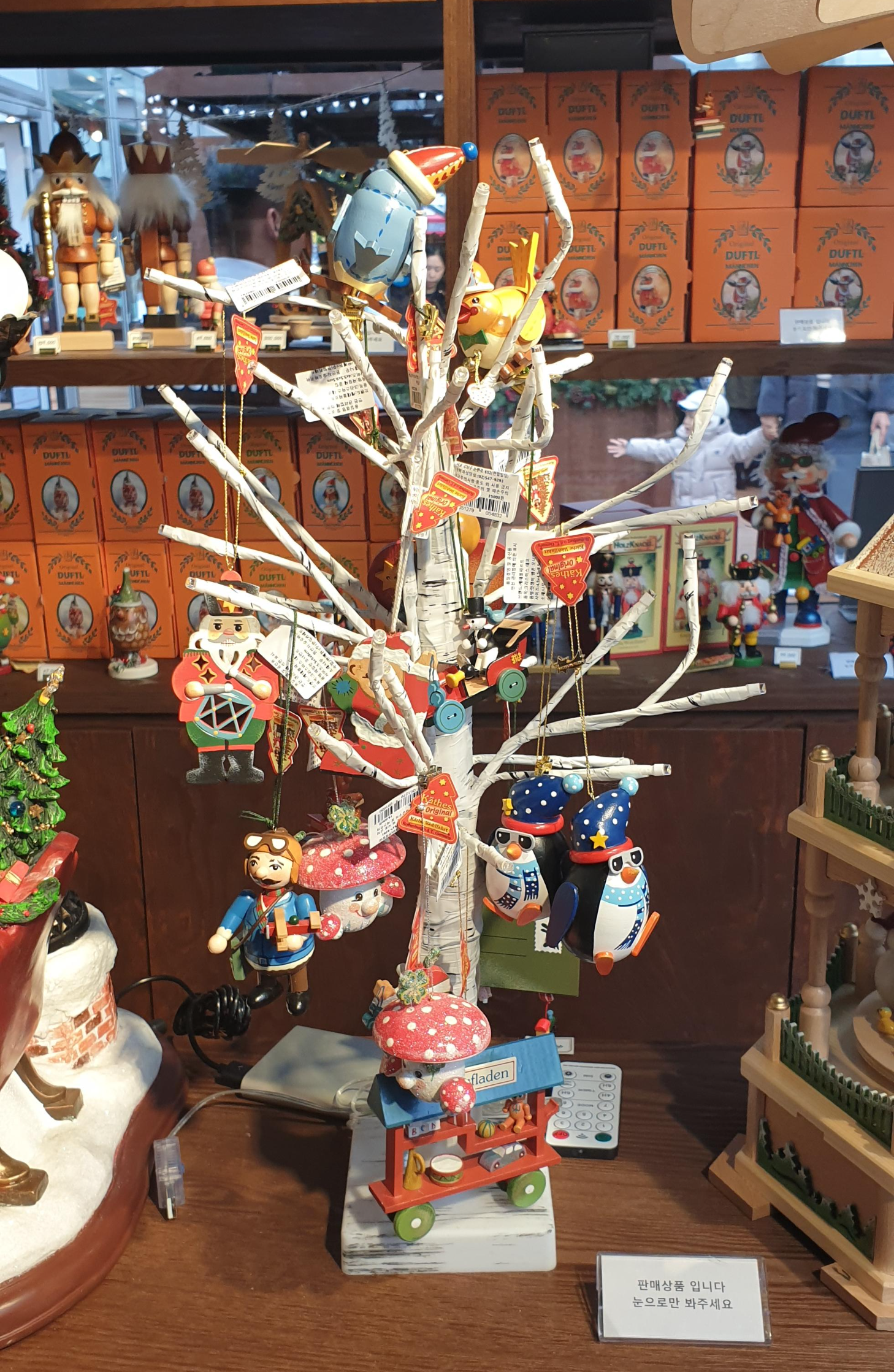 크리스마스 마켓 내부에서는 여러 가지 크리스마스 관련 소품과 주전부리가 있습니다. 트리 오너먼트와 식기, 커트러리, 오르골, 스노우볼 등 크리스마스 분위기가 물씬 나는 소품들을 팔고 있습니다.