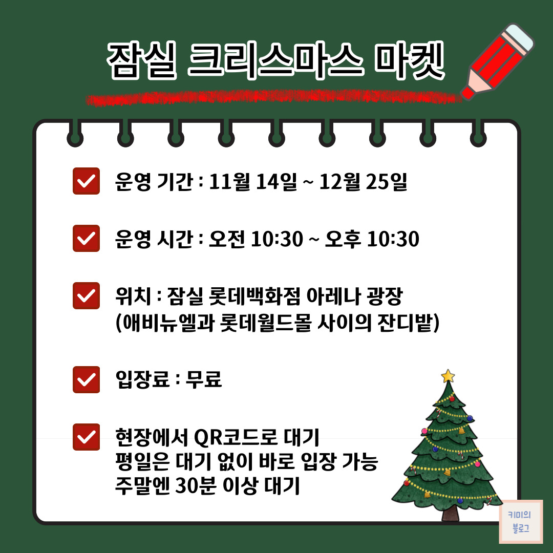 이렇게 잠실 크리스마스 마켓 평일 방문 후기와 방문 팁을 공유해 보았습니다. 평일에는 웨이팅 없이 입장할 수 있으니까 퇴근 후 크리스마스 분위기를 느껴보시기 바랍니다.