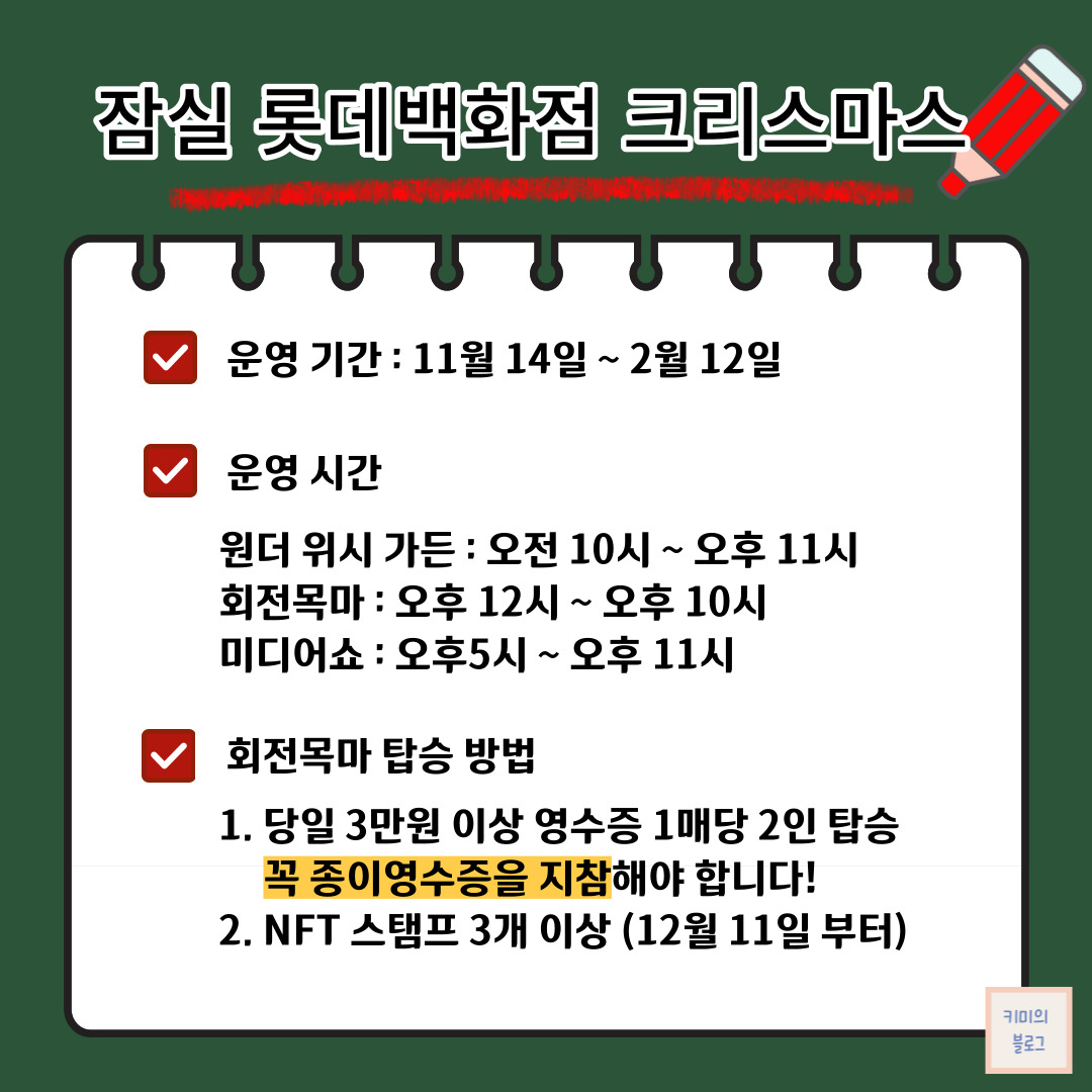 잠실 롯데백화점에는 크리스마스 마켓뿐만 아니라 대형 크리스마스트리와 회전목마도 있어서 해마다 크리스마스 명소로 유명한데요. 이용시간과 이용 팁도 같이 안내해 드리겠습니다.