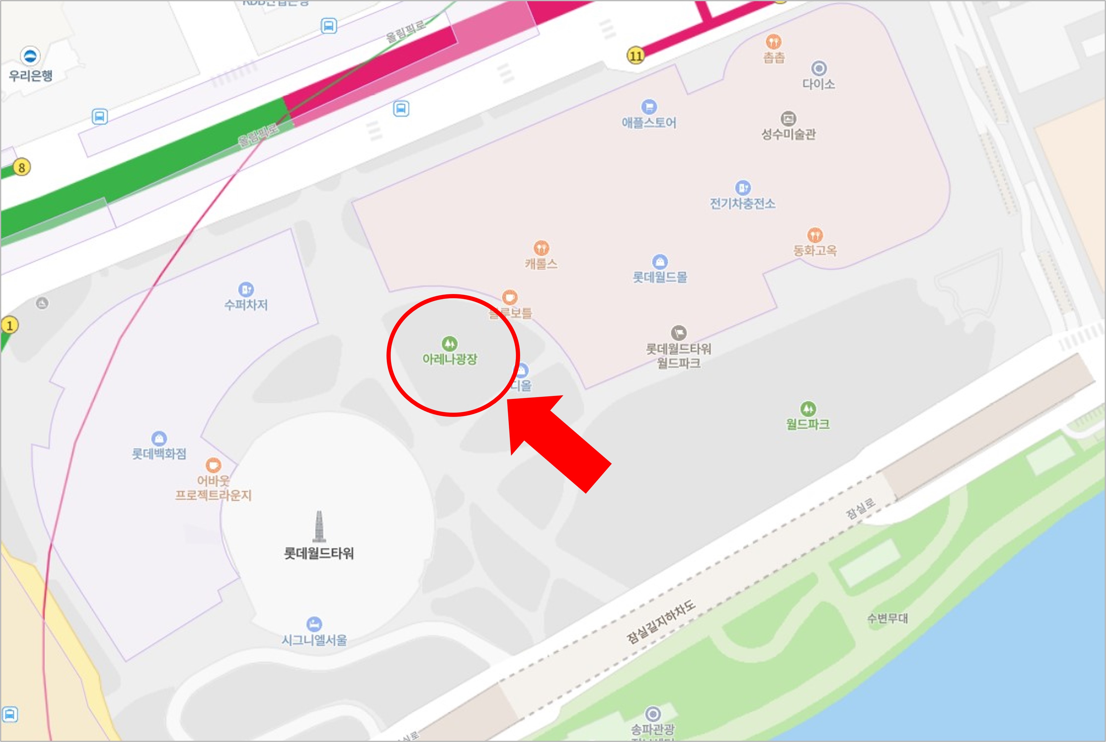 위치는 에비뉴엘과 롯데월드몰 사이에 있는 아레나 광장입니다.