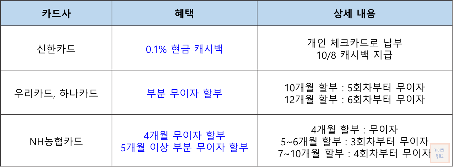 혜택이 크진 않지만 신용카드로 납부해도 수수료가 발생하지 않고, 카드사 별로 포인트 적립, 할부 서비스, 쿠폰 등의 혜택을 받을 수 있어서 신용카드를 통한 납부를 추천드립니다.